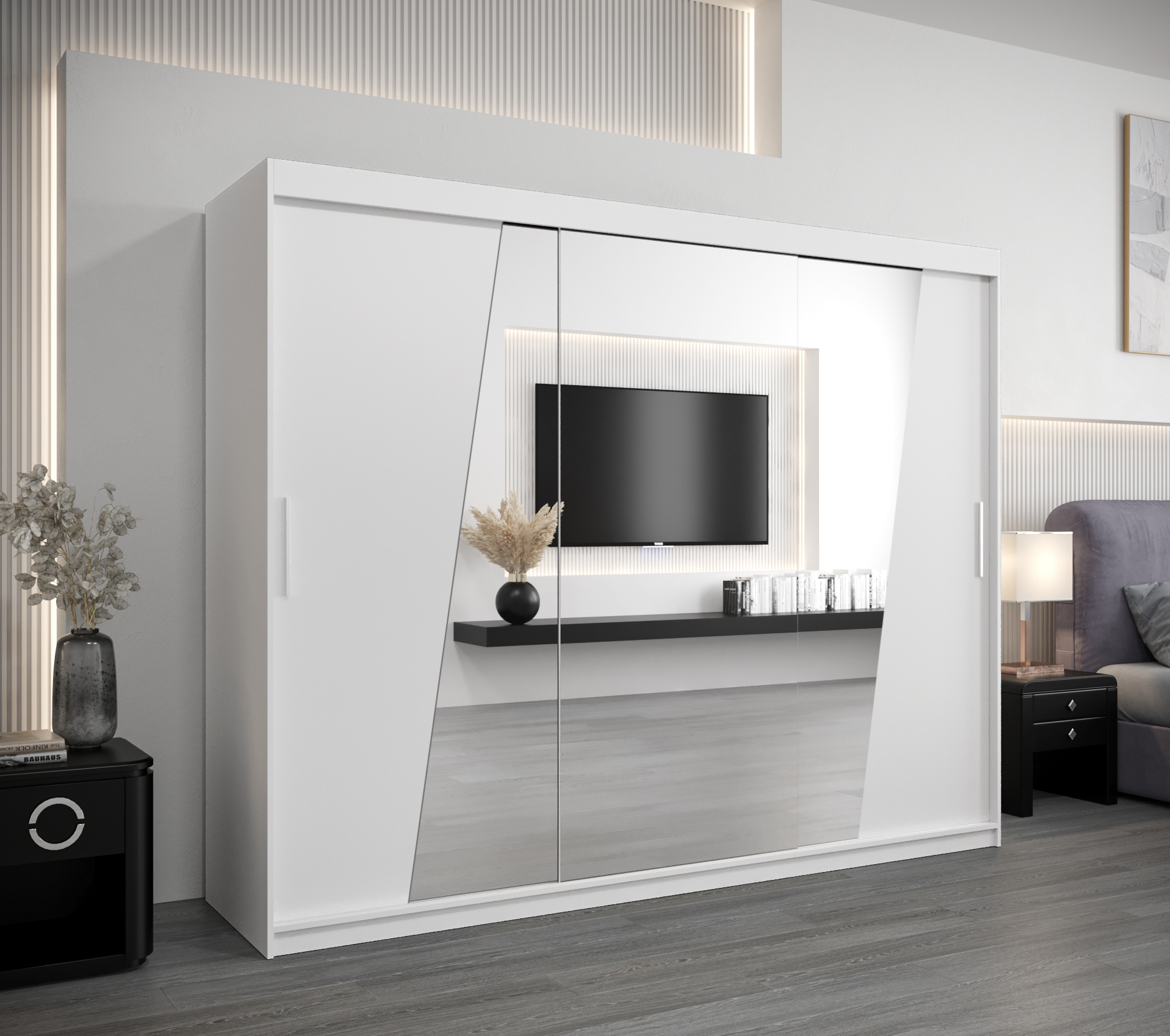 - Vnitřní uspořádání: Skříň je vybavena dvěma šatními tyčemi a policemi, s možností dokoupení zásuvek pro ještě více úložného prostoru.