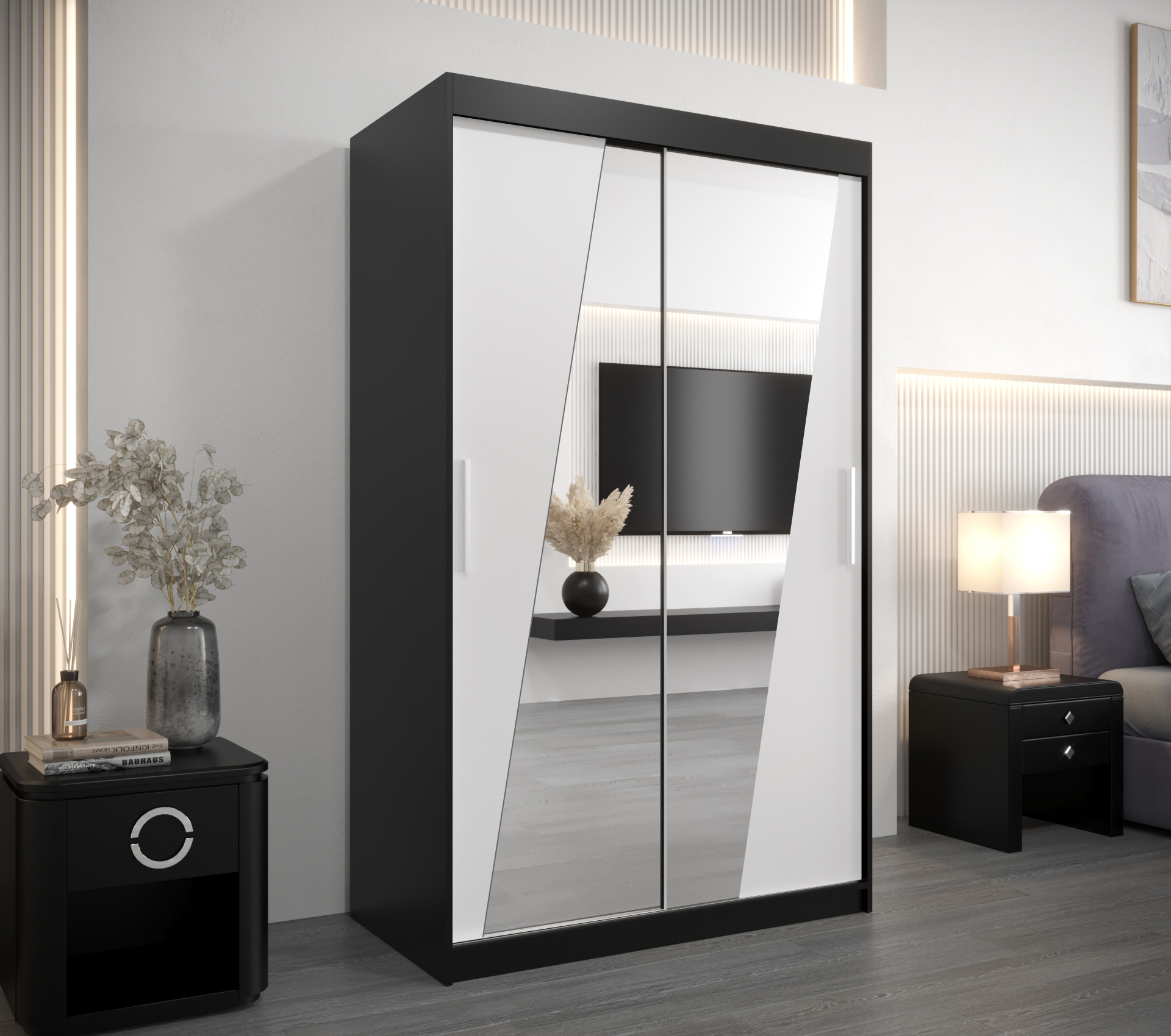 Šatní skříň Abi R0 s černým korpusem a bílými dveřmi nabízí moderní design a velký úložný prostor pro vaši ložnici.
