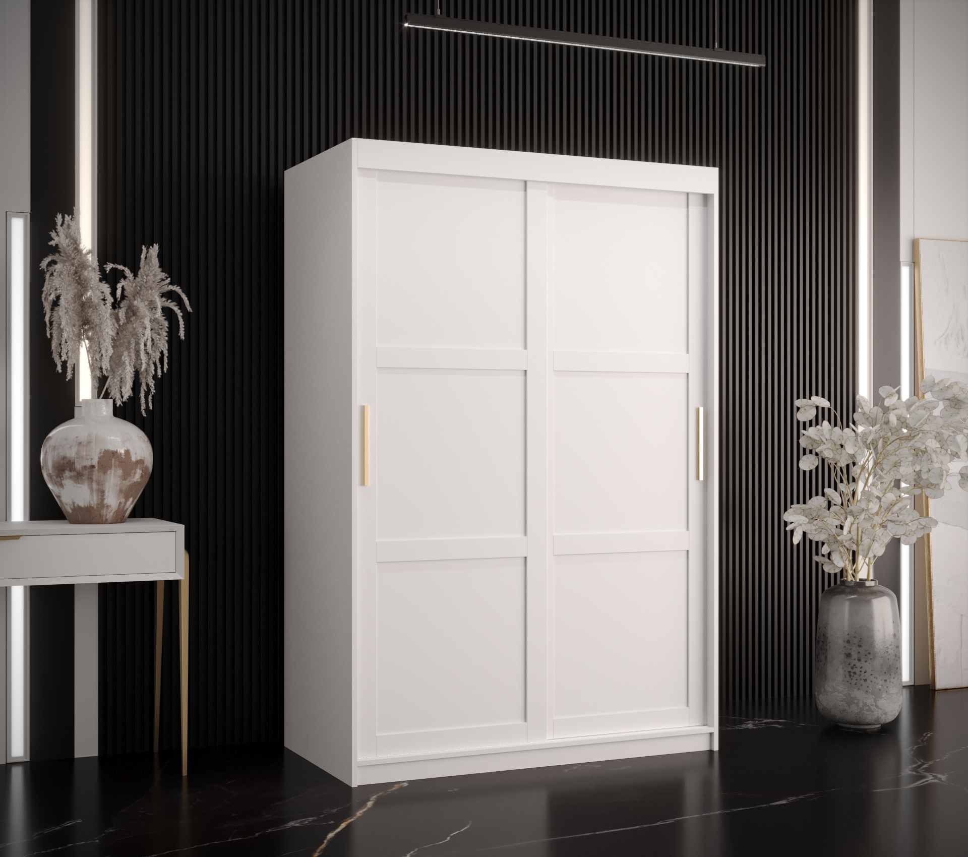 - Vnitřní uspořádání: Dvě šatní tyče a police, s možností dokoupit praktické zásuvky.