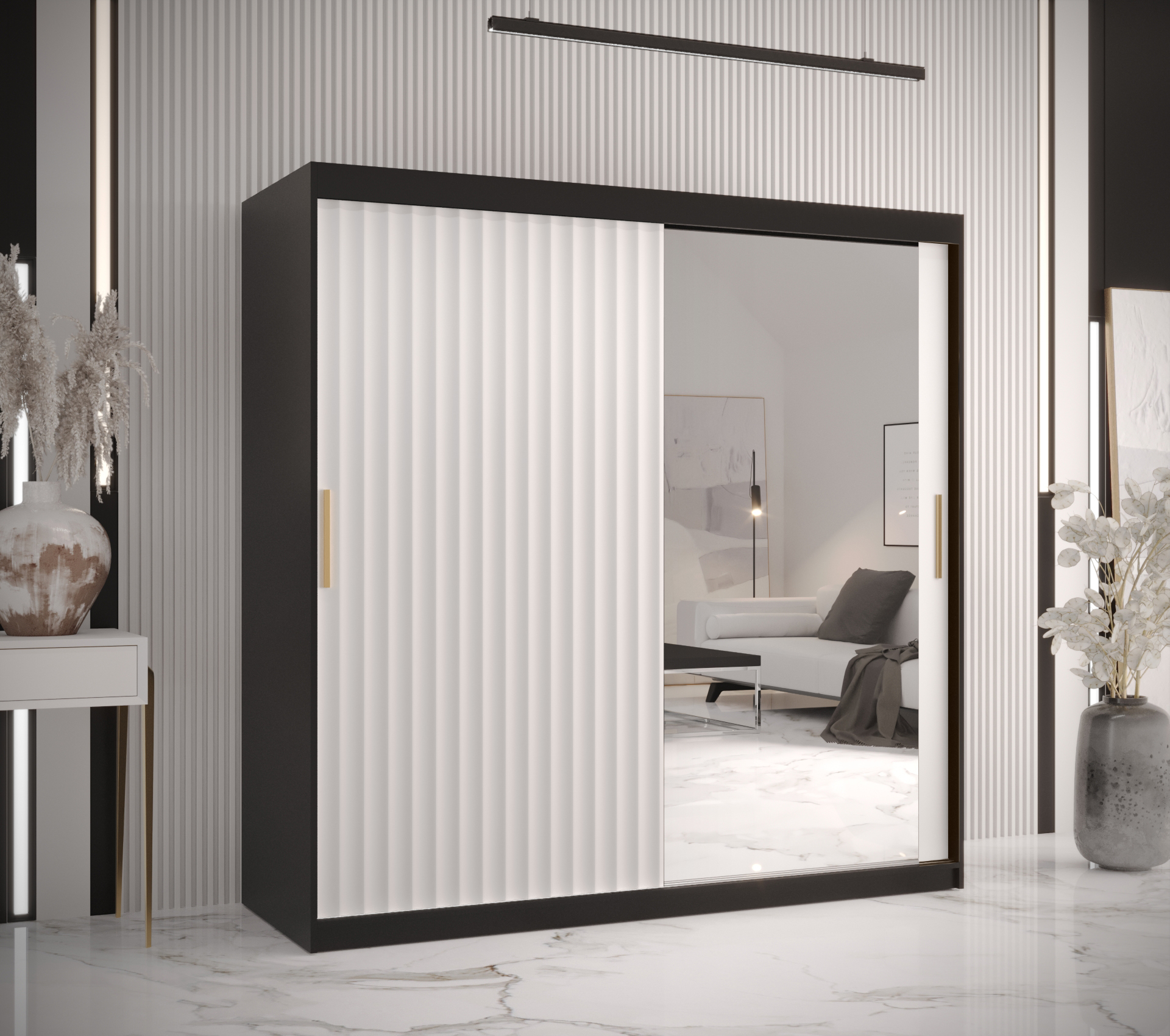 Šatní skříň Abi Riflo Wave 2 je dostupná v černé a bílé barvě, přičemž designové dveře mohou mít černé nebo bílé vlny se zrcadlem. Tato variabilita umožňuje dokonale sladit skříň s vaším interiérem.