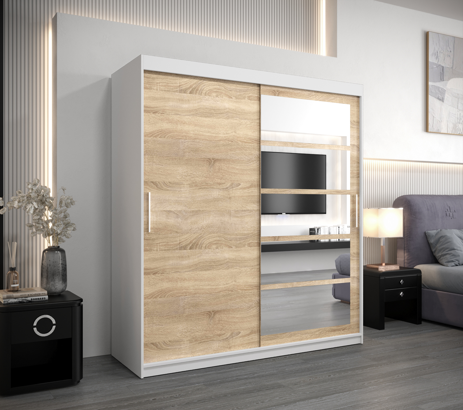 - Zrcadlo: Skříň je vybavena zrcadlem, které opticky zvětšuje prostor a přidává na praktičnosti.
