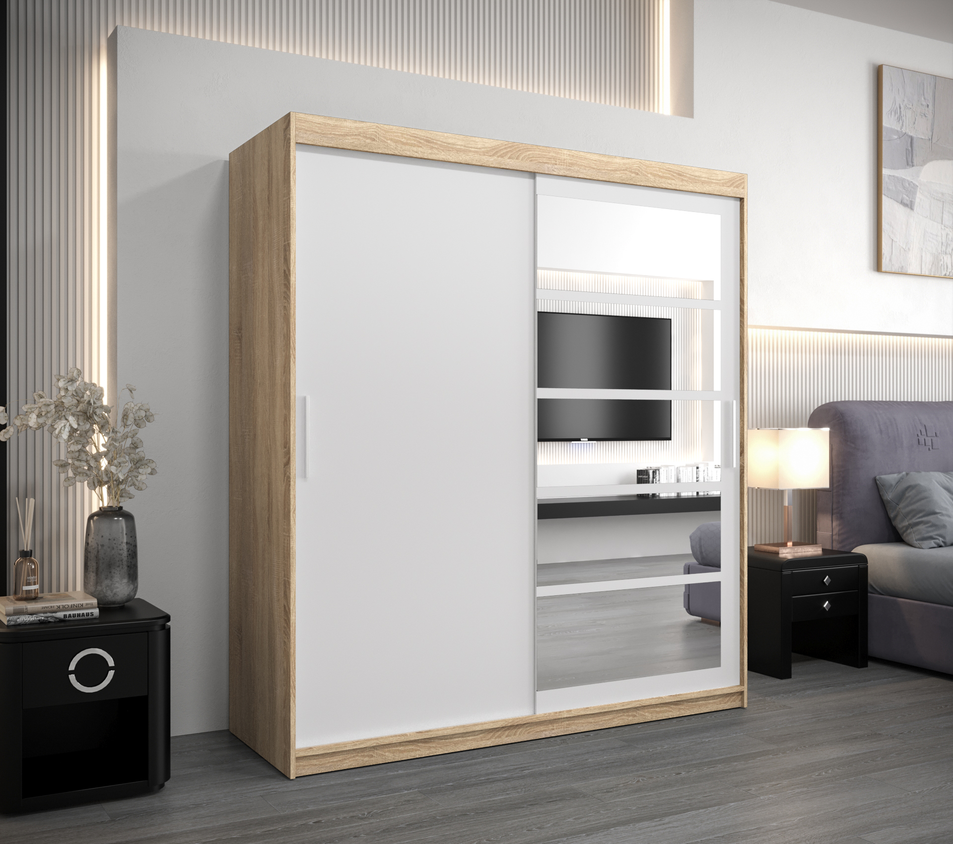 - Se zrcadlem: Šatní skříň je vybavena zrcadlem, které opticky zvětšuje prostor a usnadňuje každodenní oblékání.
