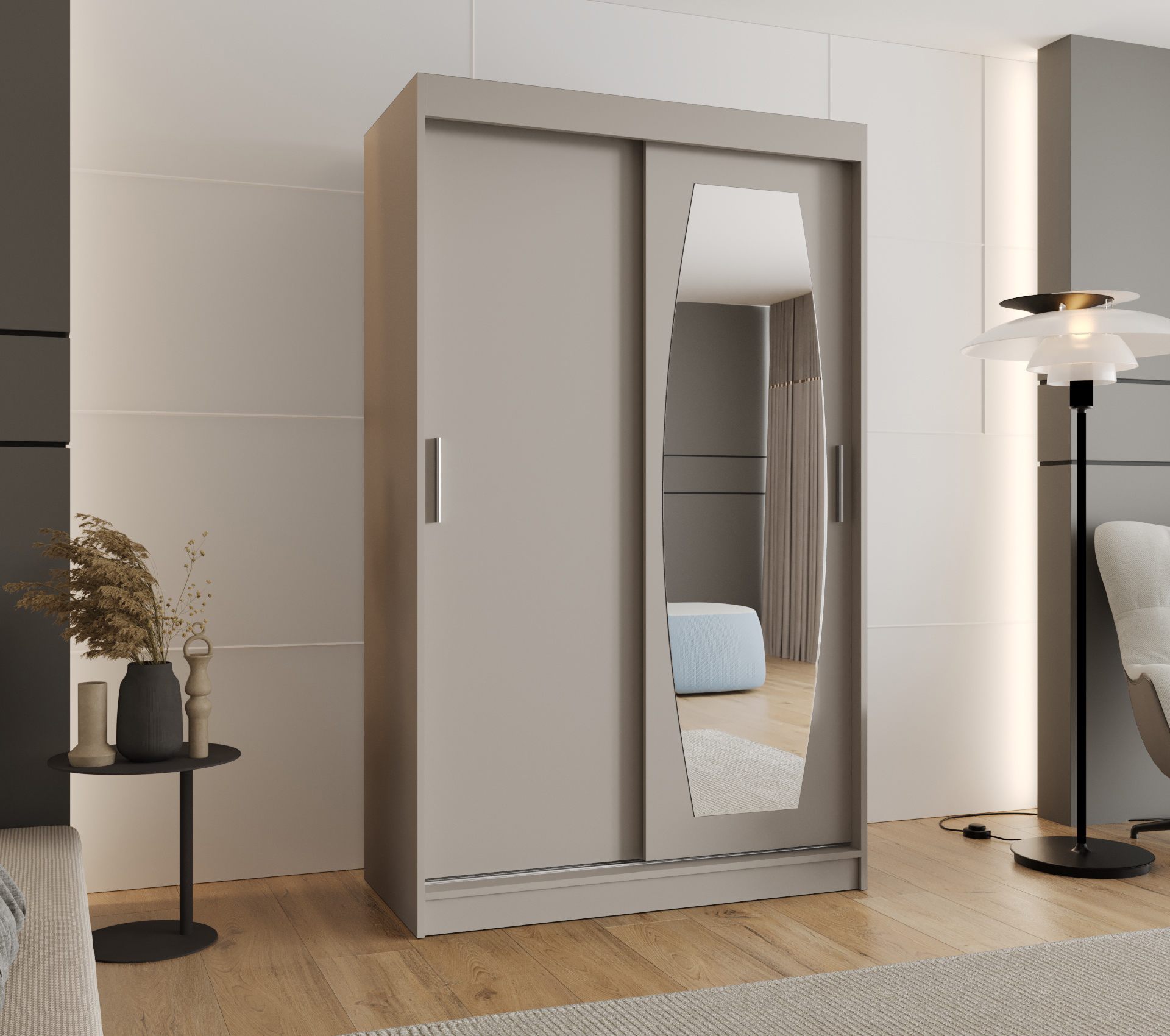 Šatní skříň Abi Rossa spojuje moderní design a funkčnost. S posuvnými dveřmi a zrcadlem je ideální pro úsporu místa.