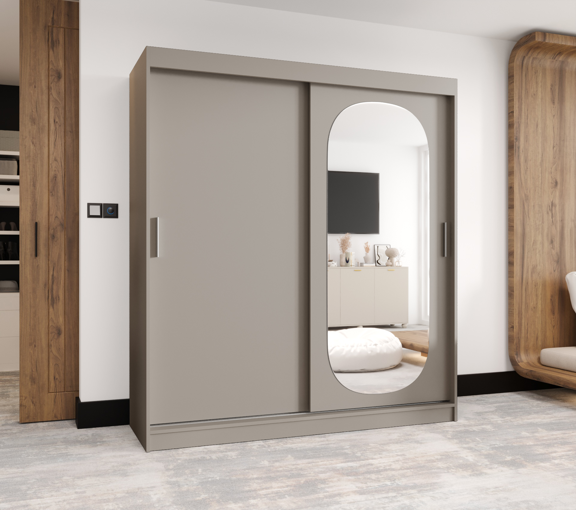 • Zrcadlo: Na dveřích skříně je leštěné zrcadlo, které opticky zvětšuje prostor a je praktickým pomocníkem při oblékání.