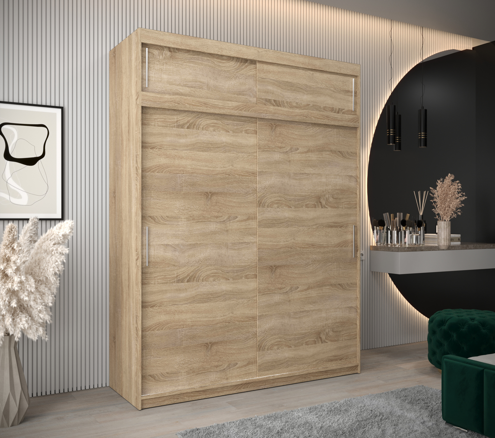 Šatní skříň Abi T0 s nástavcem je ideálním řešením pro každou ložnici, která potřebuje moderní a funkční úložný prostor. S jejími elegantními posuvnými dveřmi a atraktivním designem v barvě dubu Sonoma se stane stylovým prvkem vašeho interiéru.