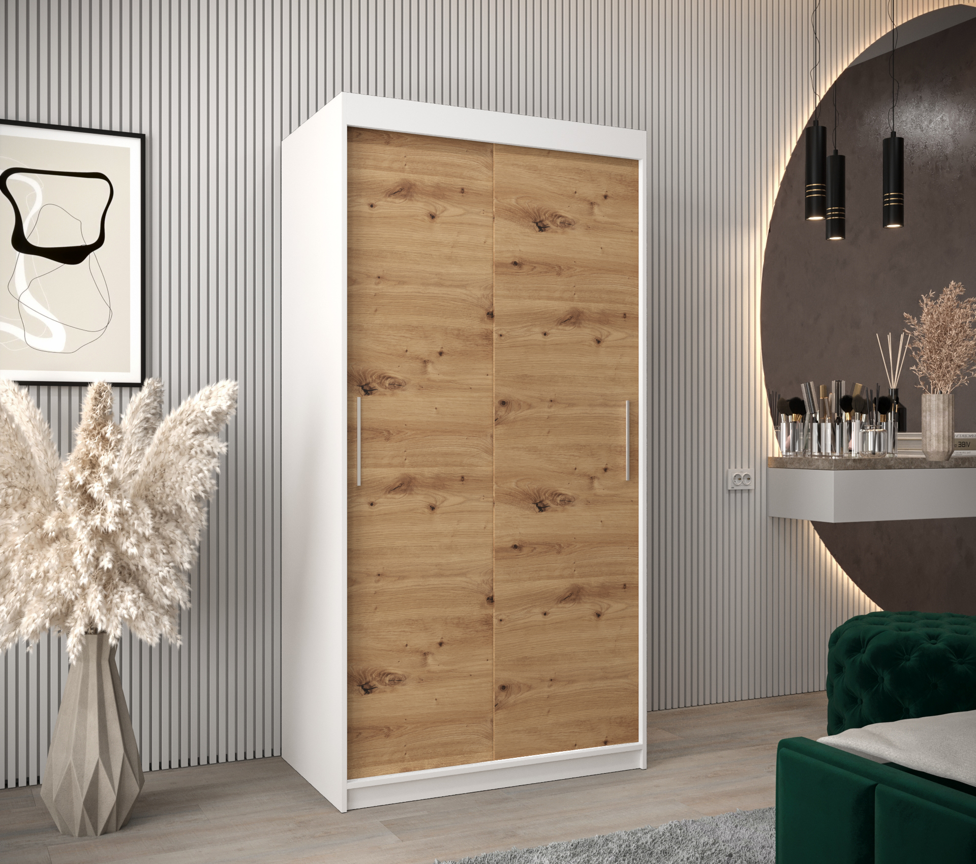 - Vnitřní uspořádání: Nabízí dostatek prostoru s dvěma šatními tyčemi a policemi, přičemž je možné dokoupit zásuvky pro další úložný prostor.