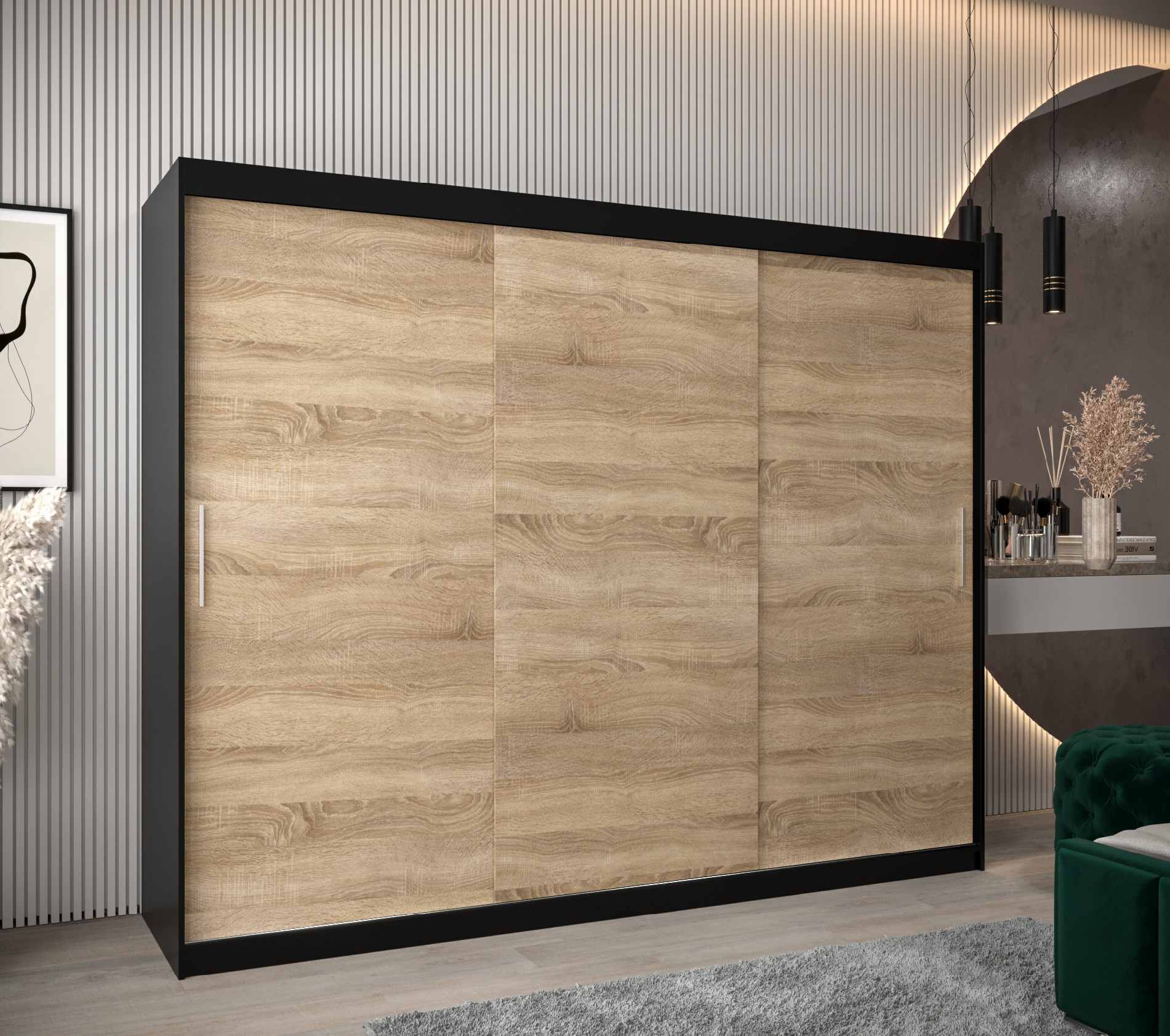 Šatní skříň Abi T0 je ideálním řešením pro každou moderní ložnici. Kombinace černého korpusu a dvířek v dekoru dub sonoma dodává skříni elegantní vzhled, který se hodí do různých interiérů. Rozměry skříně 250 cm zaručují dostatek prostoru pro vaše oblečení a doplňky.