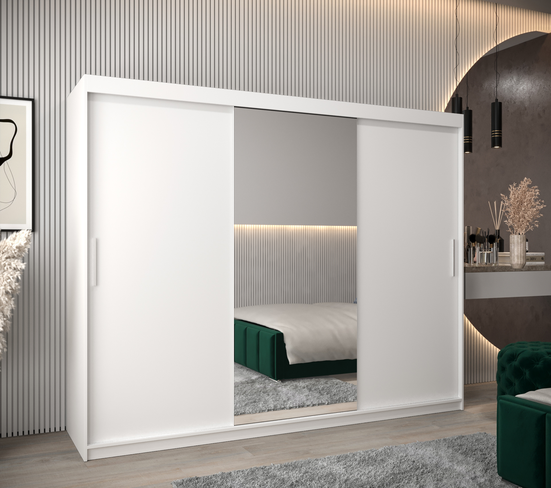 - Zrcadlo: Skříň je vybavena zrcadlem, které opticky zvětšuje prostor a poskytuje praktickou funkčnost.
