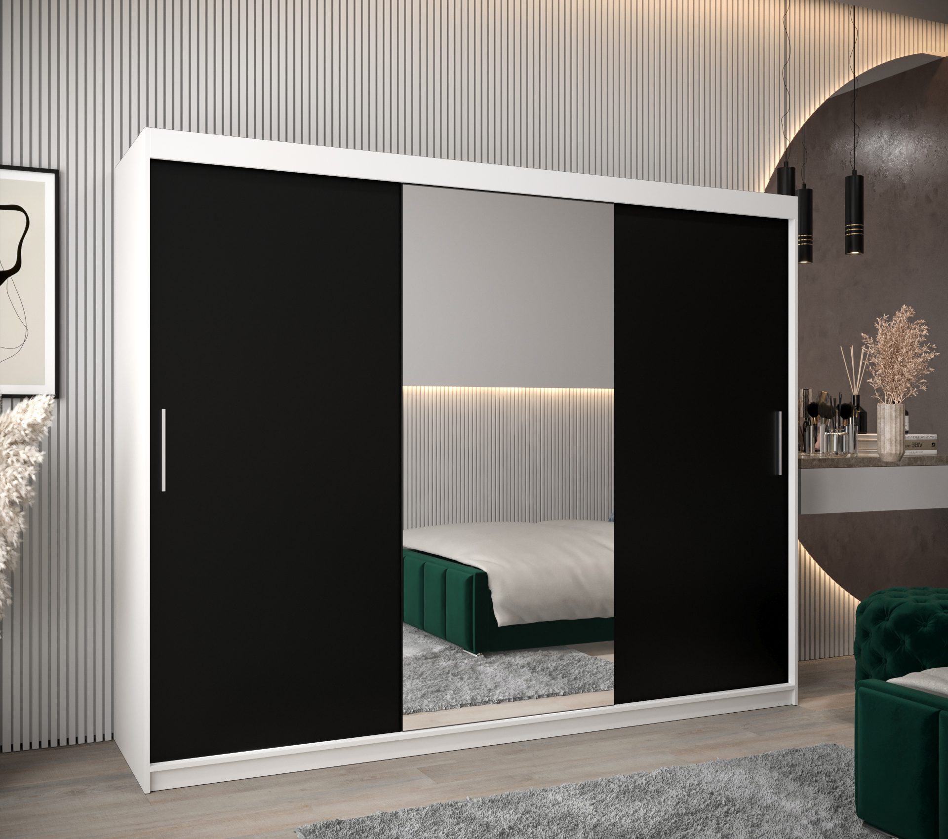 Šatní skříň Abi T1 je ideálním řešením pro každého, kdo hledá moderní a stylový kus nábytku. S elegantním bílým korpusem a černými posuvnými dveřmi se tato skříň stane skvostem ve vaší ložnici nebo předsíni.