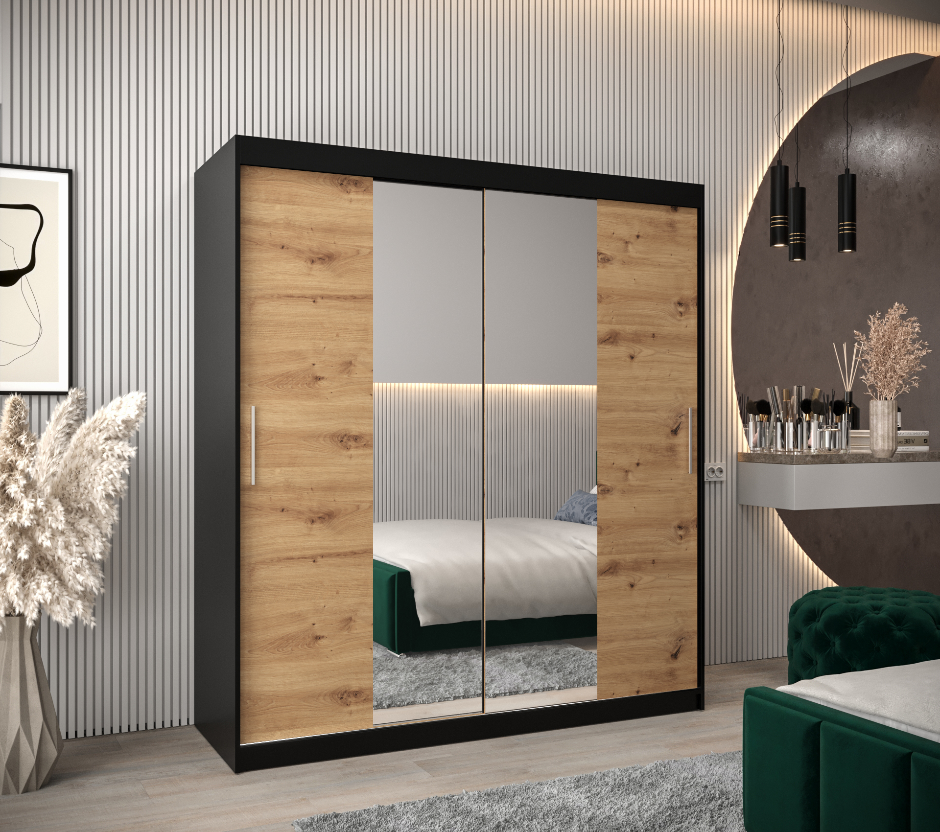 Hledáte moderní a stylovou šatní skříň, která splní vaše požadavky na úložný prostor? Šatní skříň Abi T1 v černém provedení s dveřmi v dekoru dub artisan je ideálním řešením pro každou ložnici. S rozměry 180 cm nabízí dostatek místa pro vaše oblečení a další osobní věci.