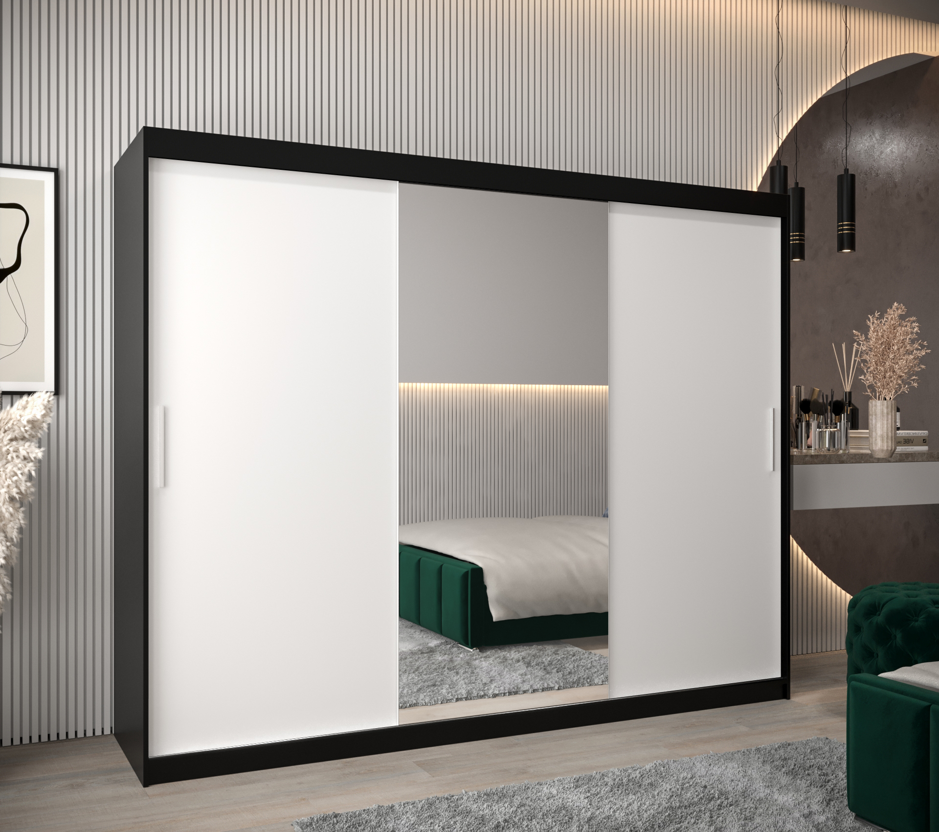 - Zrcadlo: Skříň je vybavena zrcadlem, které opticky zvětšuje prostor a přidává na funkčnosti.