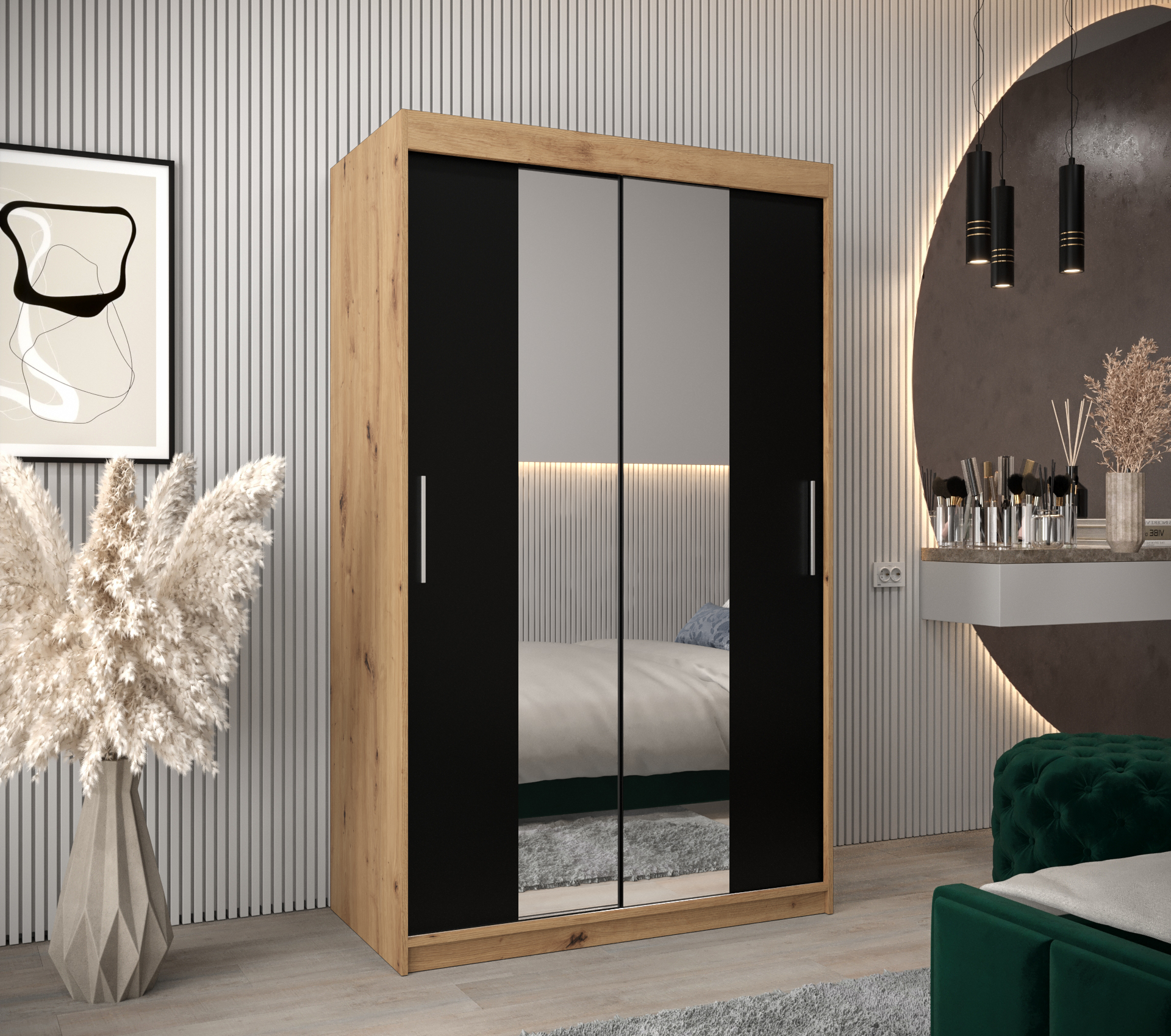 Šatní skříň Abi T1 je ideálním řešením pro moderní interiéry, které vyžadují stylový a praktický nábytek. S rozměry 120 cm a originálním vzhledem v barvě dub artisan s černými posuvnými dveřmi, tato skříň nejenže poskytuje dostatek úložného prostoru, ale také se stává atraktivním prvkem ve vaší ložnici.