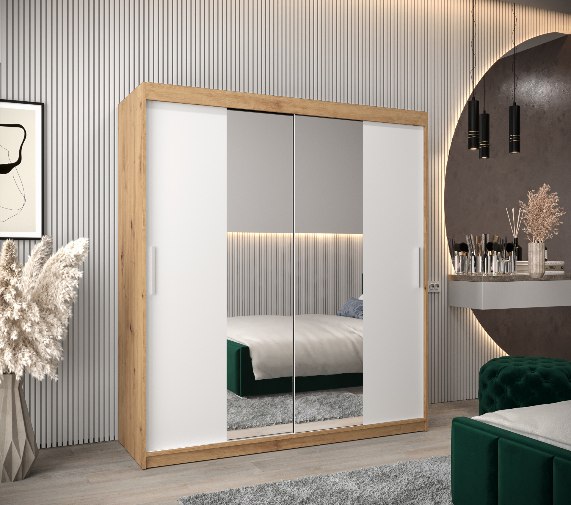 - Stylové provedení: Kombinace dub artisan s bílými dveřmi a zrcadlem dodává skříni moderní vzhled.