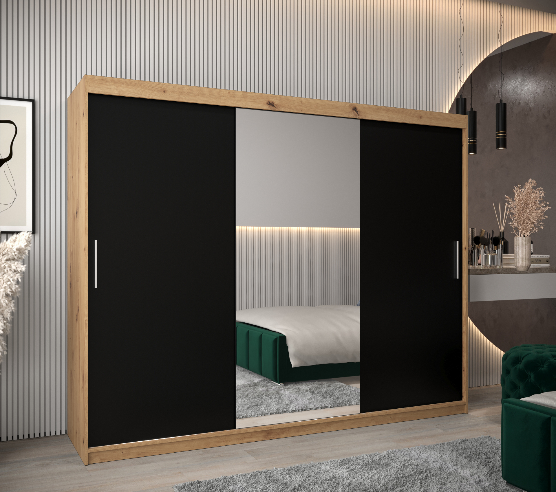 Šatní skříň Abi T1 je ideálním řešením pro ty, kteří hledají moderní a funkční úložný prostor. Tento kus nábytku v dekoru dub artisan s elegantními černými posuvnými dveřmi přináší do vašeho domova styl a praktičnost.