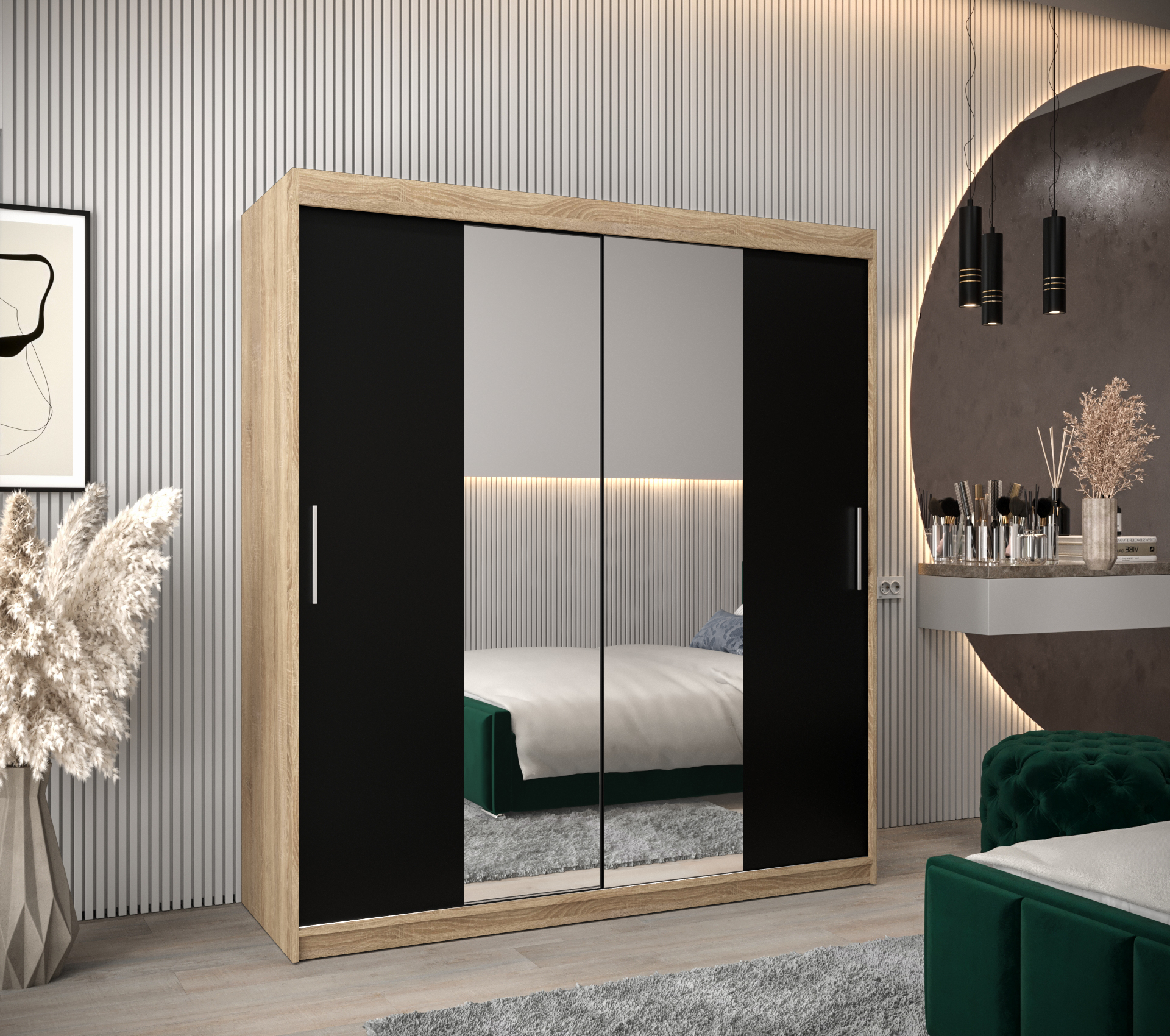 - Vnitřní uspořádání: Skříň nabízí dvě šatní tyče a police, s možností dokoupit zásuvky pro ještě více úložného prostoru.