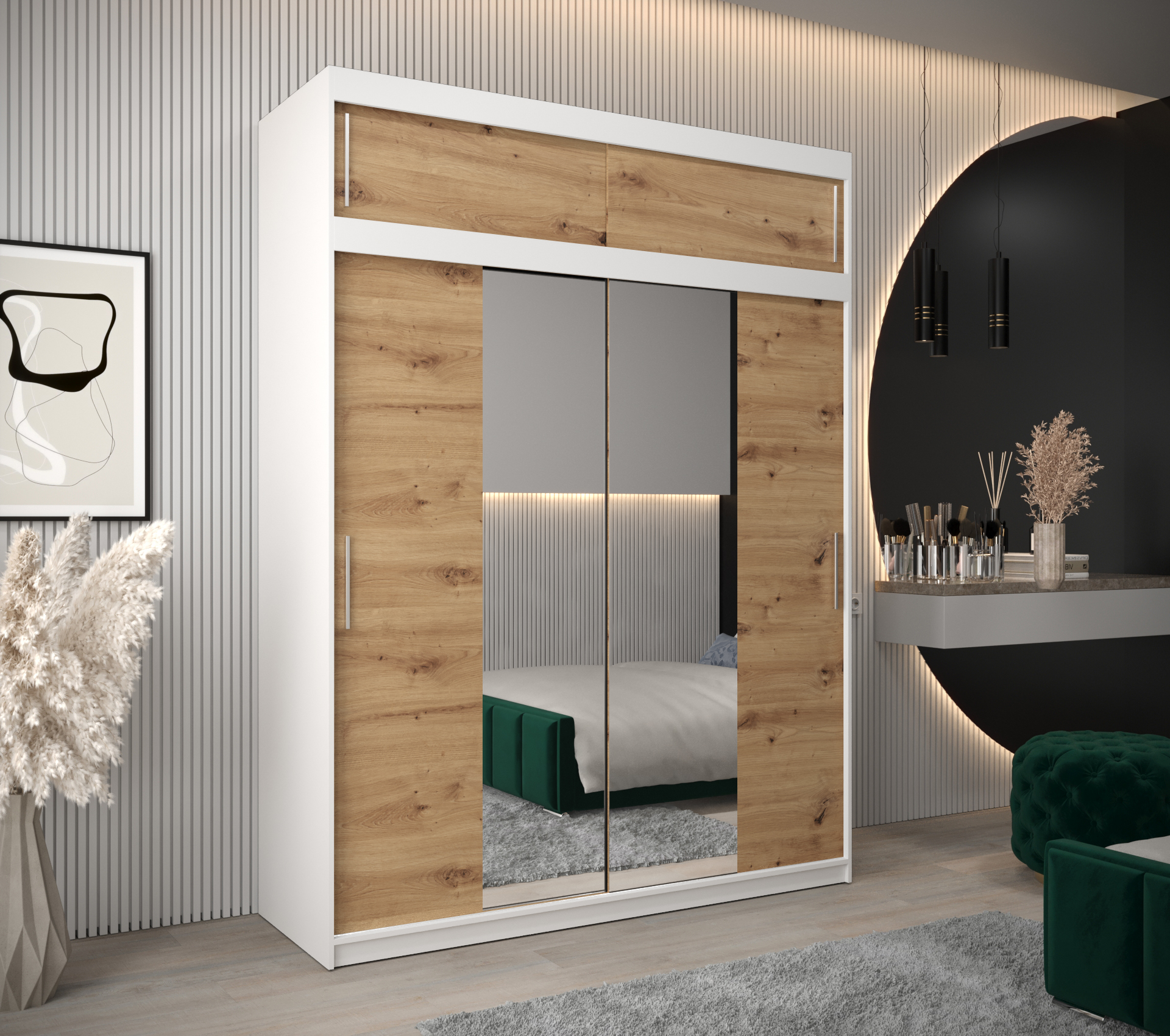Šatní skříň Abi T1 s nástavcem je ideálním řešením pro ty, kteří hledají moderní a stylový nábytek do své ložnice. S jejími rozměry 180 cm a elegantním bílým korpusem se stane skvělým doplňkem každého interiéru. Dveře skříně v dekoru dub artisan dodávají skříni na atraktivitě a jedinečnosti.