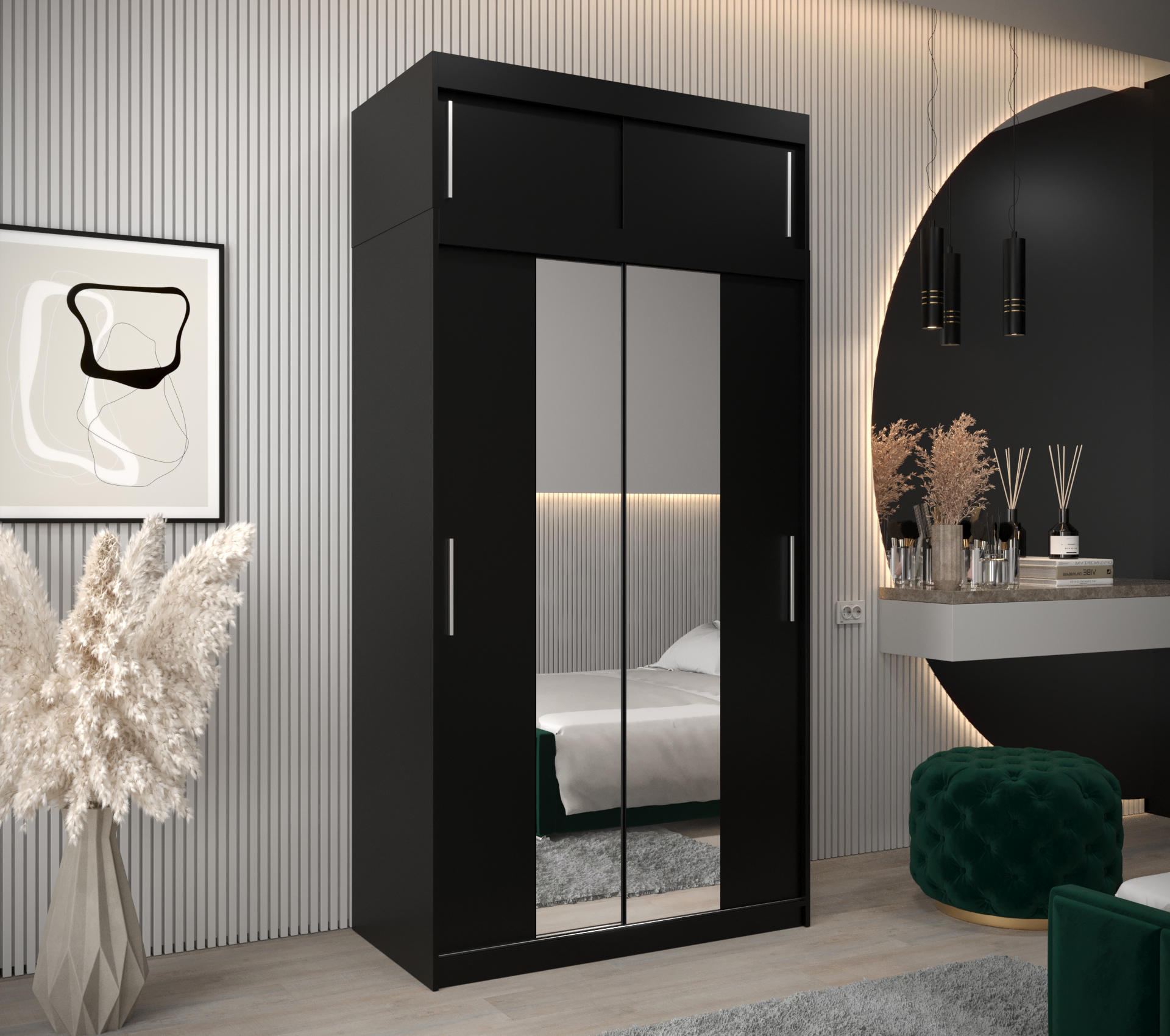 Šatní skříň Abi T1 s nástavcem je ideálním řešením pro každého, kdo hledá stylovou a praktickou skříň do své ložnice. Tato moderní skříň s posuvnými dveřmi v černé barvě se nejenom skvěle hodí do jakéhokoli interiéru, ale také poskytuje dostatek úložného prostoru pro vaše oblečení a další věci.