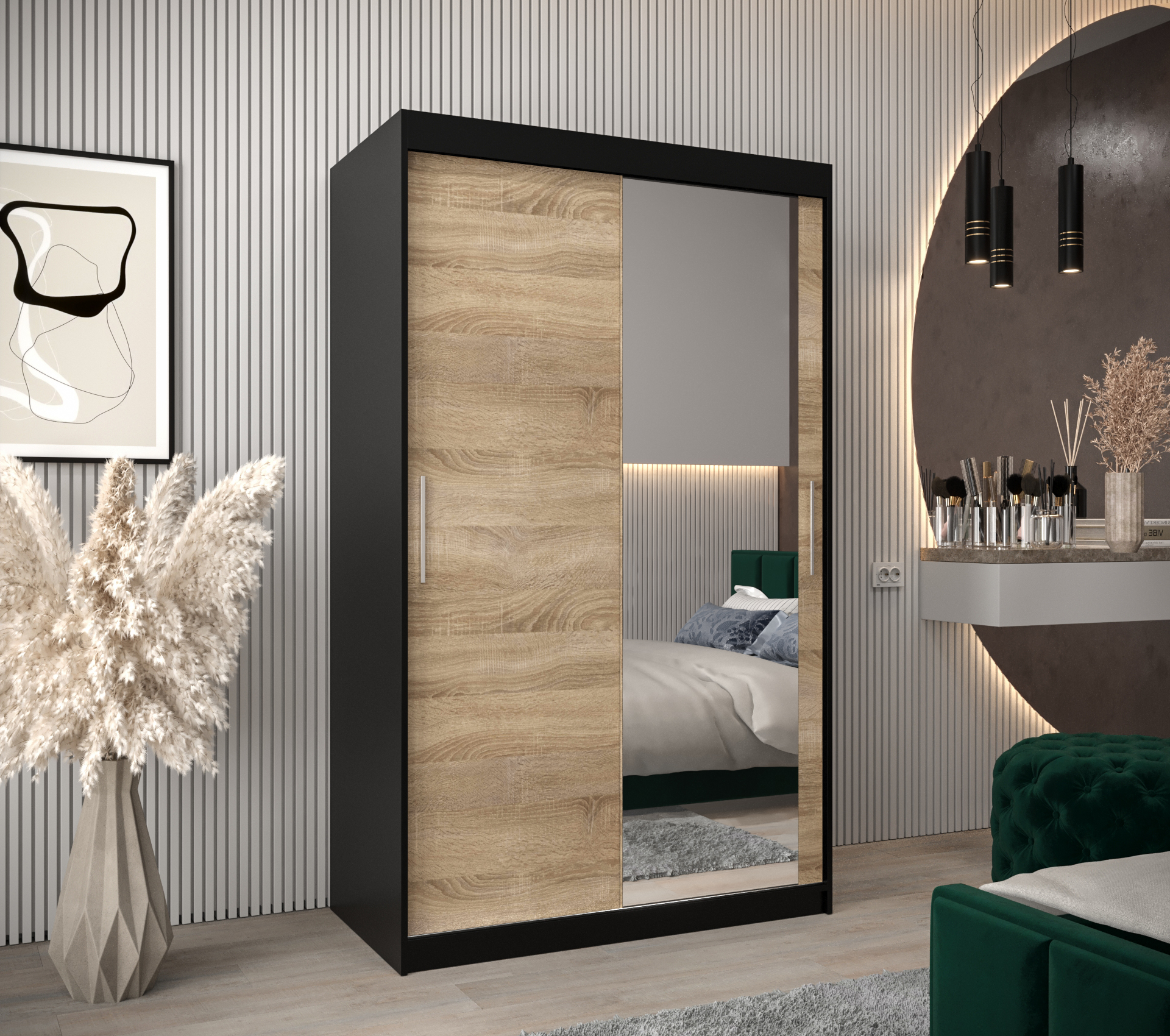 Šatní skříň Abi T2 je ideálním řešením pro každého, kdo hledá moderní a stylový nábytek do své ložnice. S jejími posuvnými dveřmi a elegantními liniemi se stane skvostem vaší domácnosti. Korpus v černé barvě v kombinaci s dveřmi v dekoru dub sonoma přináší do interiéru harmonii a estetiku.