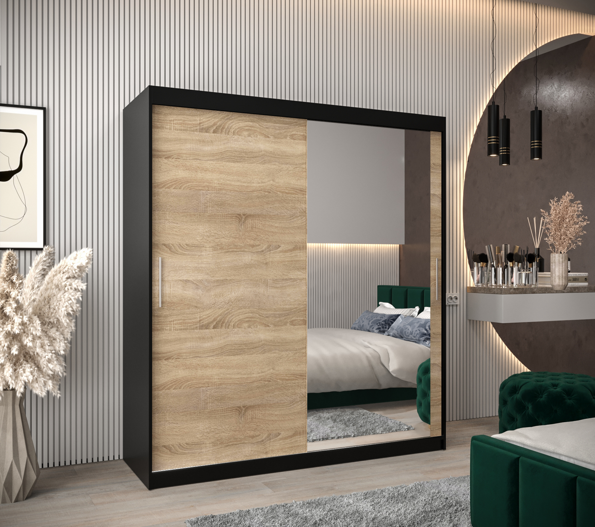 Hledáte stylovou a praktickou šatní skříň, která se hodí do každého interiéru? Šatní skříň Abi T2 v černém provedení s dveřmi v dekoru dub sonoma je ideálním řešením pro vaši ložnici. S rozměry 180 cm poskytuje dostatek úložného prostoru pro vaše oblečení a doplňky.