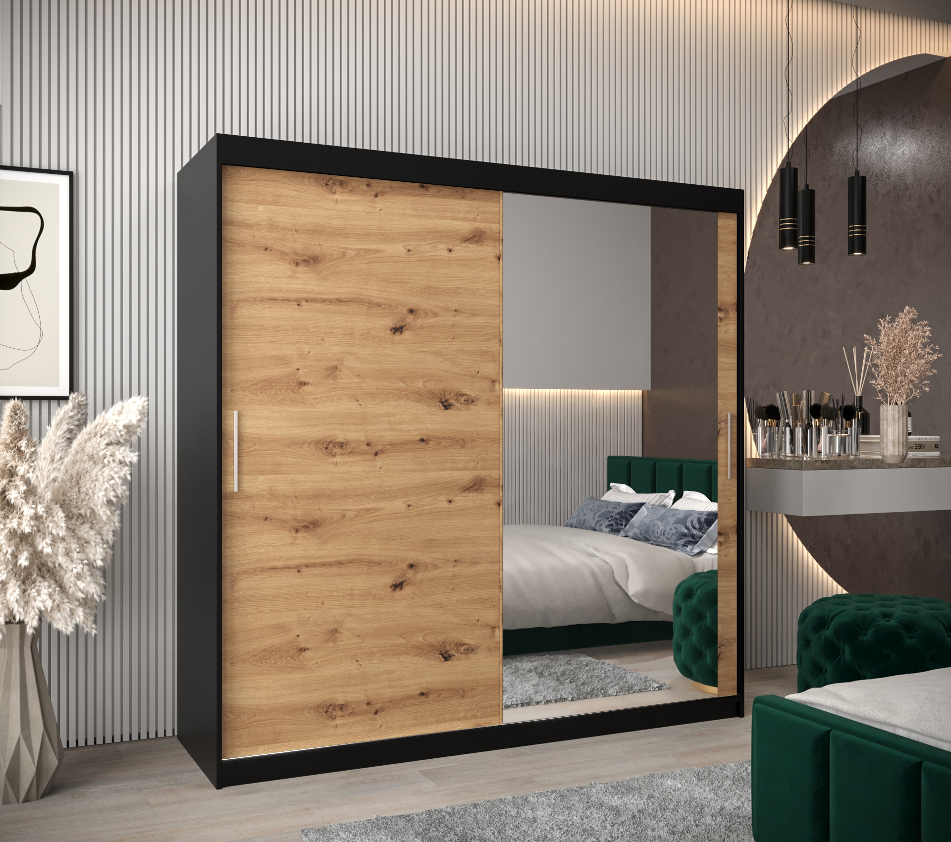 Šatní skříň Abi T2 v elegantní černé barvě je ideálním řešením pro každou ložnici, kde hledáte moderní a praktické úložné možnosti. S rozměry 200 cm nabízí dostatek prostoru pro uskladnění vašich oděvů a doplňků. Posuvné dveře z dubu artisan dodávají skříni originální vzhled, který skvěle zapadne do jakéhokoli interiéru.