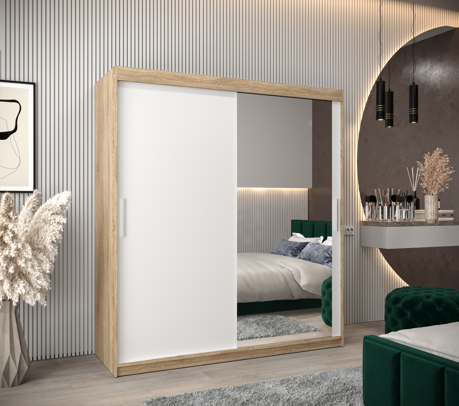 - Zrcadlo: Součástí skříně je zrcadlo, které opticky zvětšuje prostor a je praktickým pomocníkem při oblékání.
