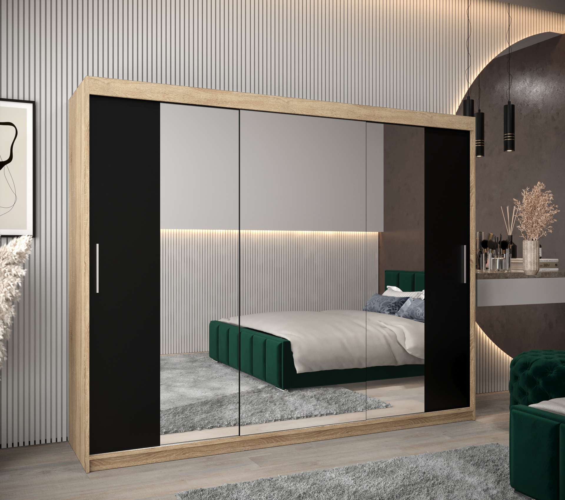 Šatní skříň Abi T2 je ideálním řešením pro ty, kteří hledají moderní a stylový nábytek do své ložnice. S rozměry 250 cm a elegantními černými posuvnými dveřmi, tato skříň nabízí nejen velký úložný prostor, ale i atraktivní design.