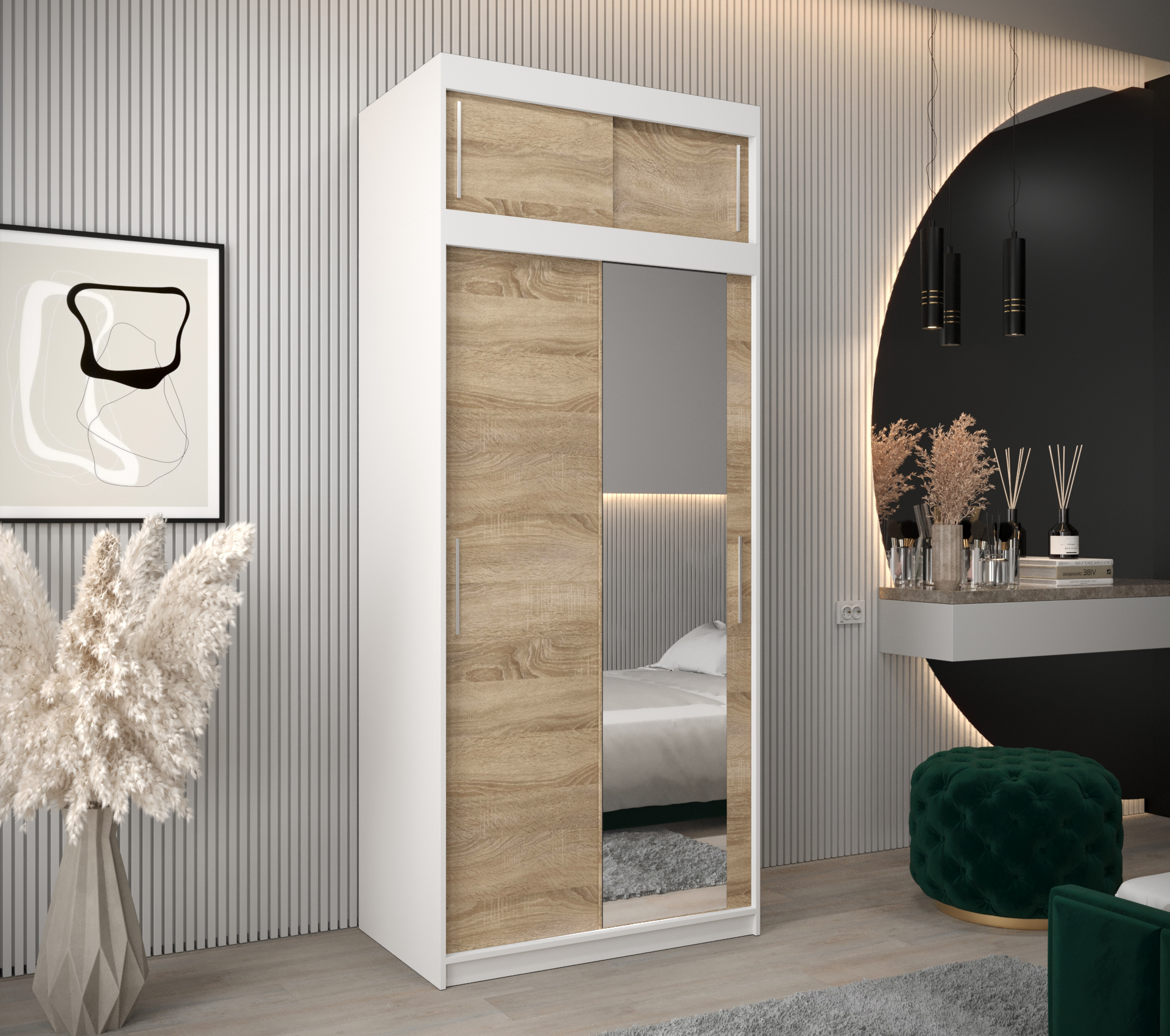 - Zrcadlo: Šatní skříň je vybavena zrcadlem, které opticky zvětšuje prostor a usnadňuje výběr oblečení.