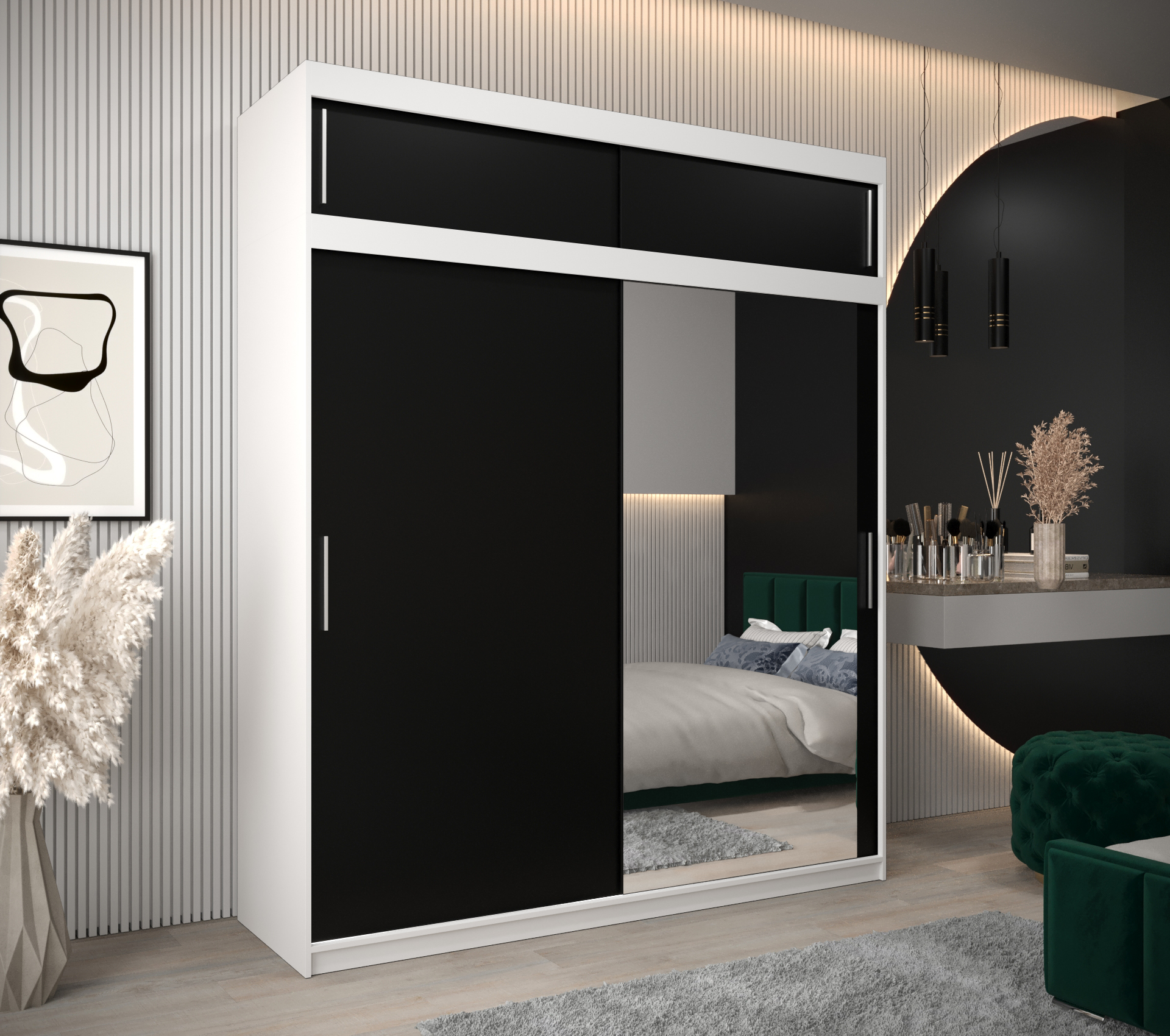 Šatní skříň Abi T2 s nástavcem je ideálním řešením pro ty, kteří hledají moderní a praktický úložný prostor. Její elegantní design v bílé barvě s černými posuvnými dveřmi přináší do každého interiéru nádech elegance a stylu. S výškou 240 cm a šířkou 200 cm poskytuje dostatek místa na vaše oblečení a další osobní věci.
