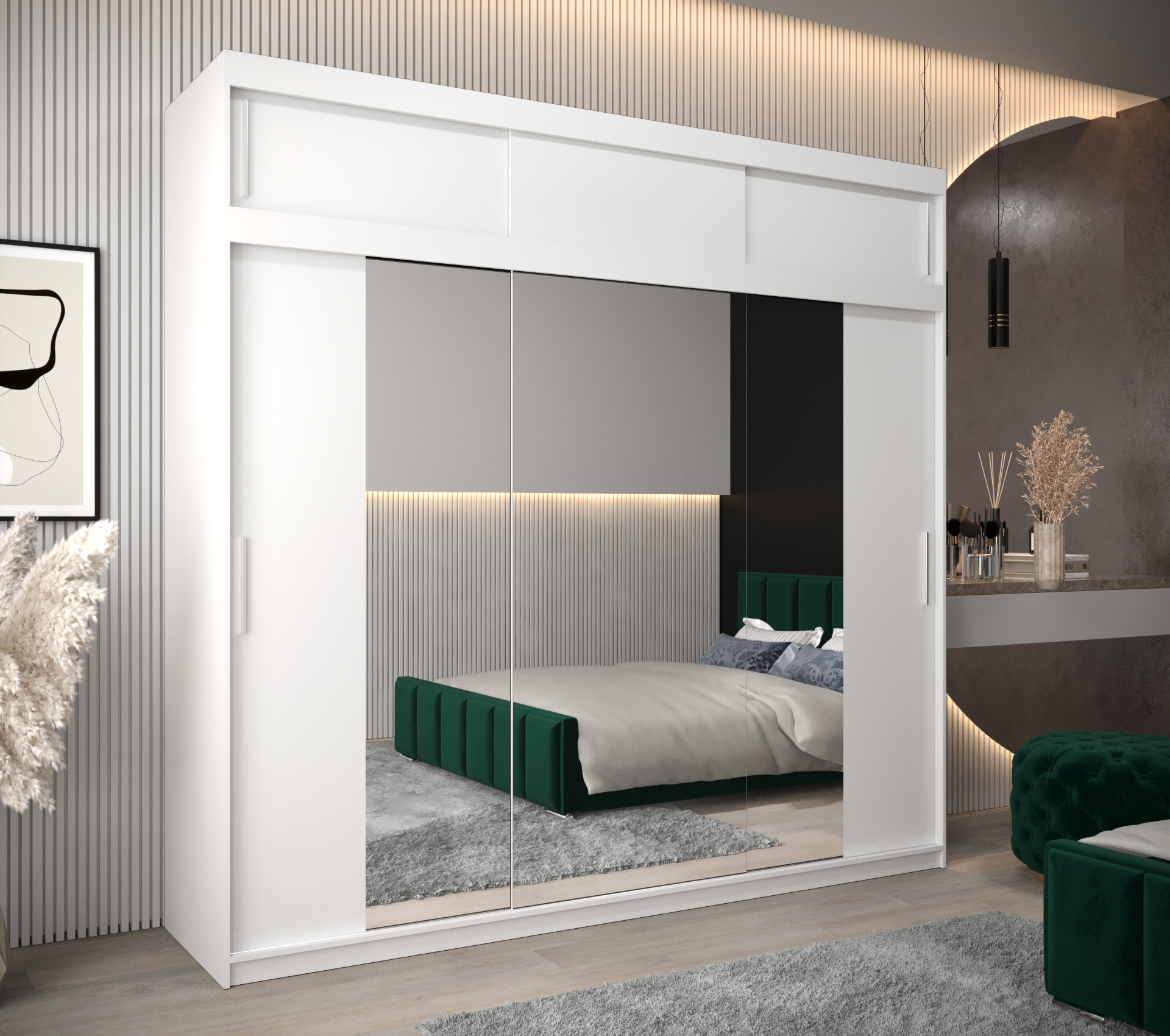 - Prostor pro zrcadlo: Skříň je vybavena zrcadlem, které opticky zvětšuje prostor.