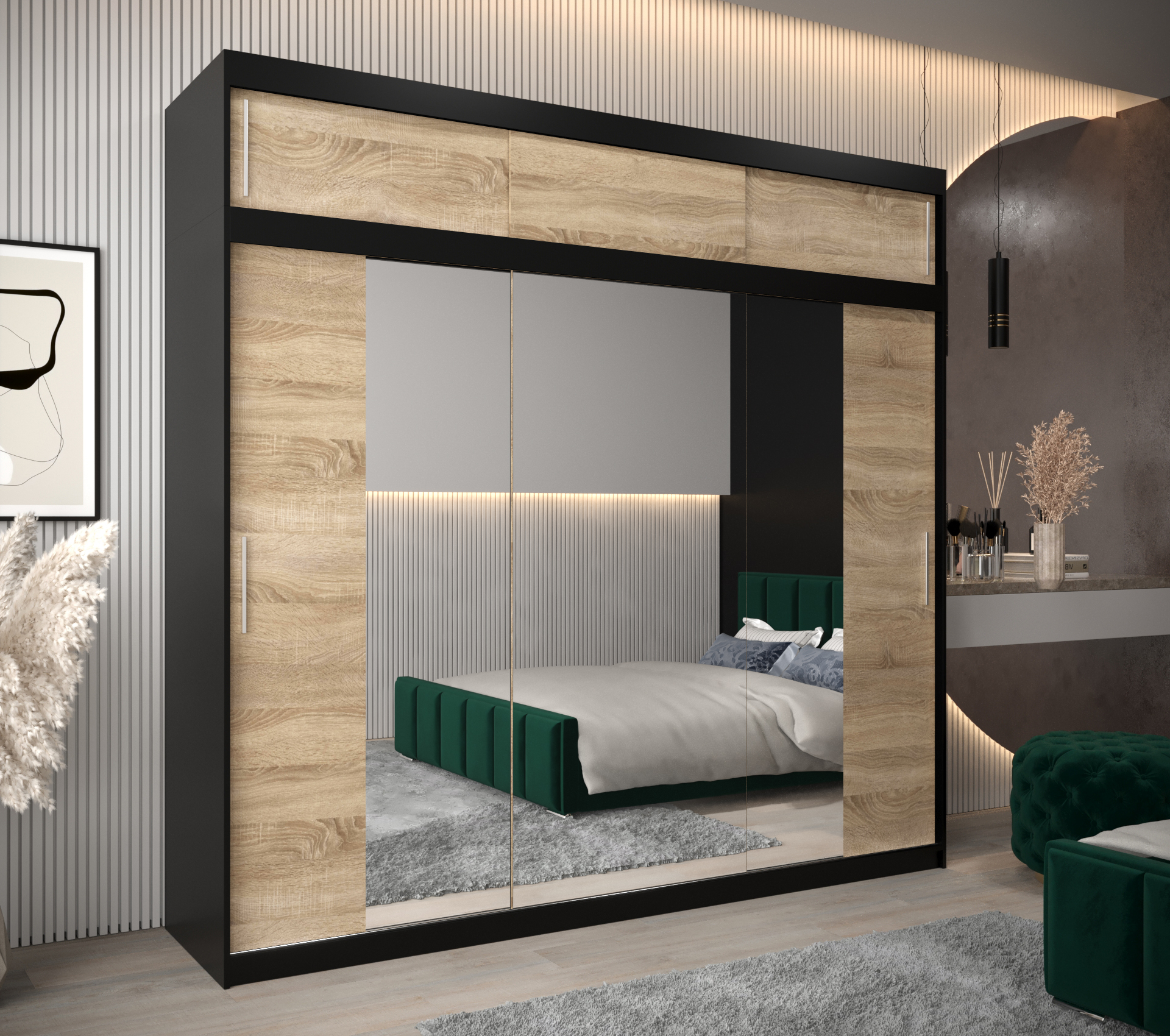 - Zrcadlo: Součástí skříně je zrcadlo, které opticky zvětšuje prostor a přidává na stylu.