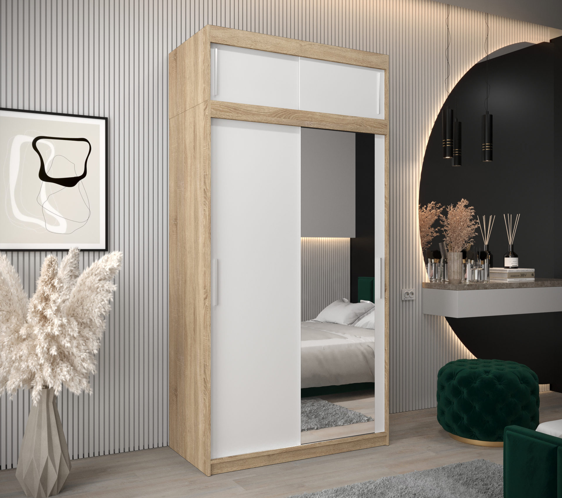 - Zrcadlo: Skříň je vybavena zrcadlem, které opticky zvětšuje prostor a přidává na eleganci.