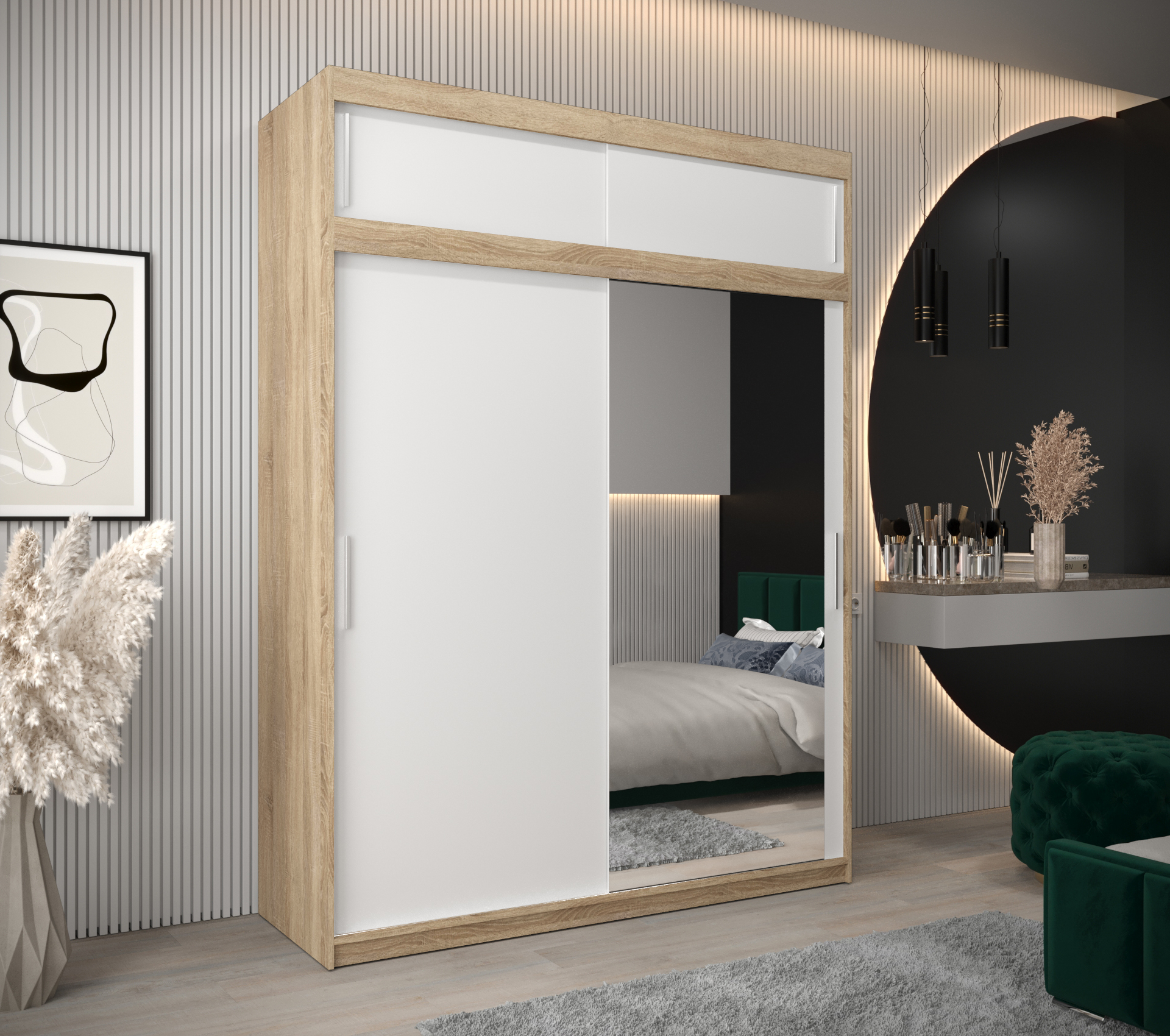 - Zrcadlo: Součástí skříně je praktické zrcadlo, které opticky zvětšuje prostor a usnadňuje každodenní přípravy.
