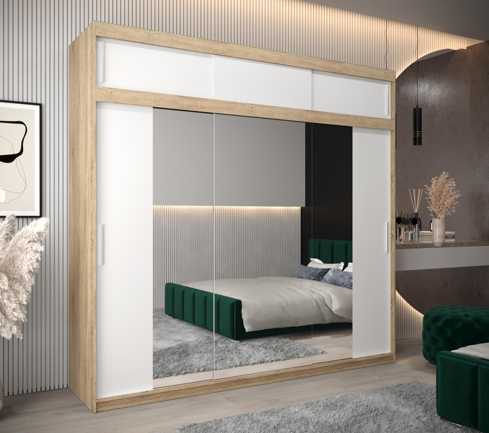 Šatní skříň Abi T2 s nástavcem představuje ideální řešení pro ty, kteří hledají moderní a prostorný nábytek do ložnice. Její elegantní design v kombinaci s praktickými funkcemi ji činí skvělou volbou pro každou domácnost. Korpus skříně je vyroben z kvalitní laminované dřevotřískové desky v dekoru dub Sonoma, což jí dodává příjemný a nadčasový vzhled.