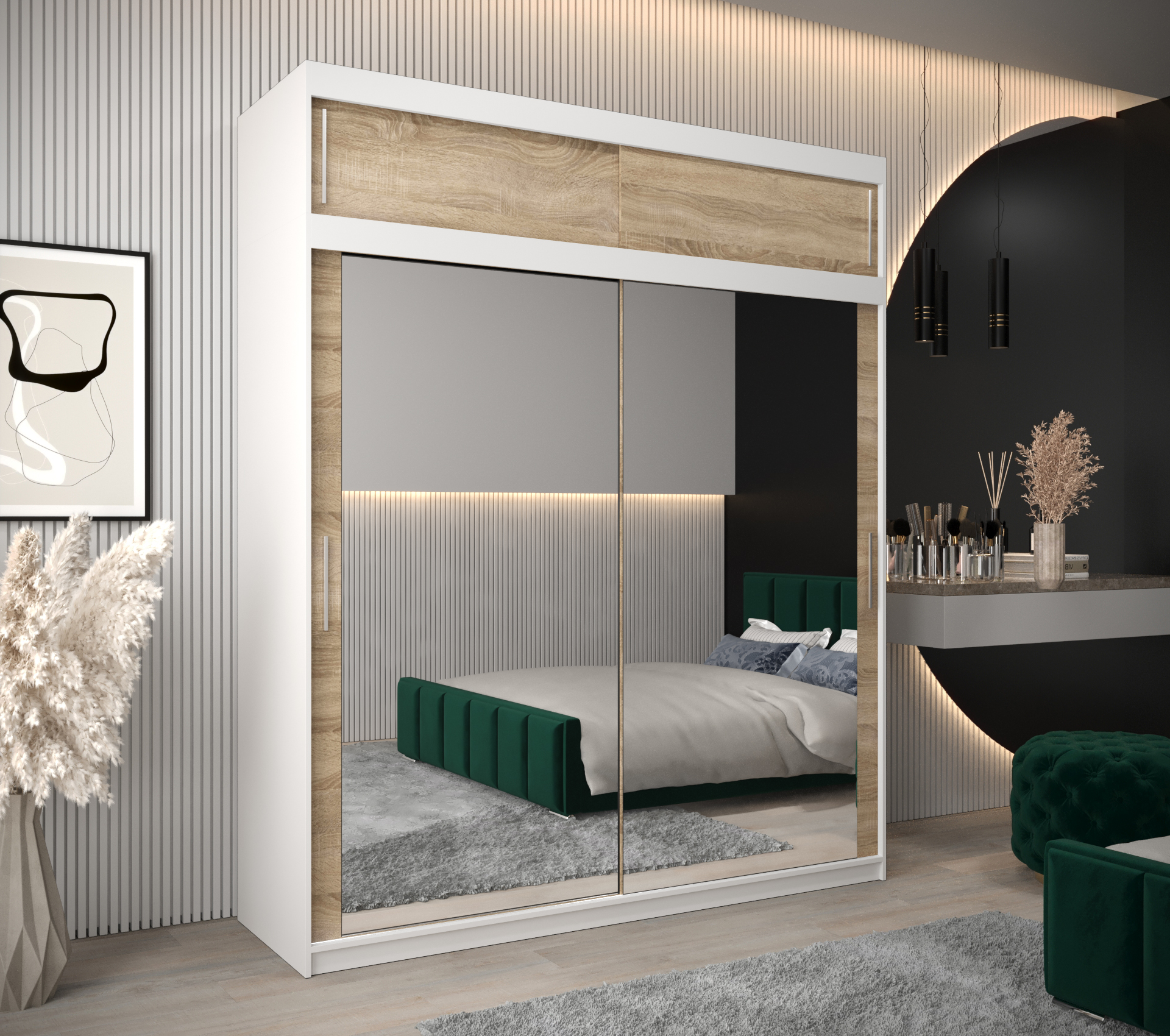 - Zrcadlo: Skříň je vybavena zrcadlem, které opticky zvětšuje prostor a poskytuje pohodlný pohled na váš outfit.