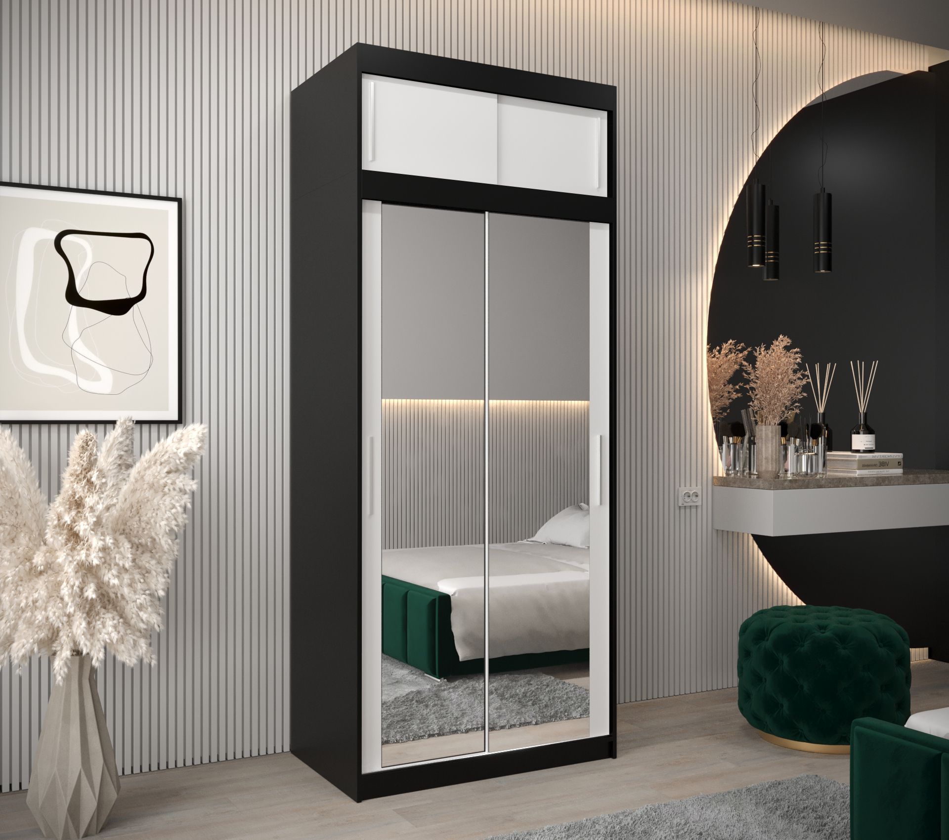 Šatní skříň Abi T3 s nástavcem představuje ideální volbu pro ty, kteří hledají moderní a funkční nábytek do své ložnice. S elegantním černým korpusem a bílými posuvnými dveřmi se stane stylovým prvkem vašeho interiéru.