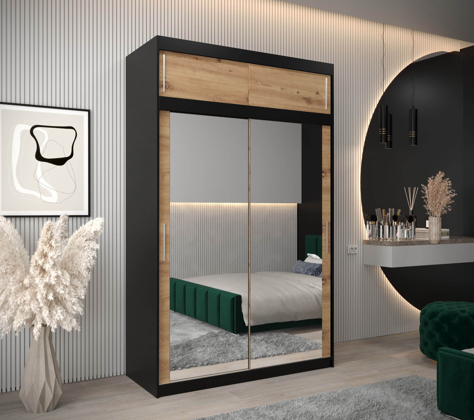 - Zrcadlo: Skříň je vybavena zrcadlem, které opticky zvětšuje prostor a přidává na eleganci.
