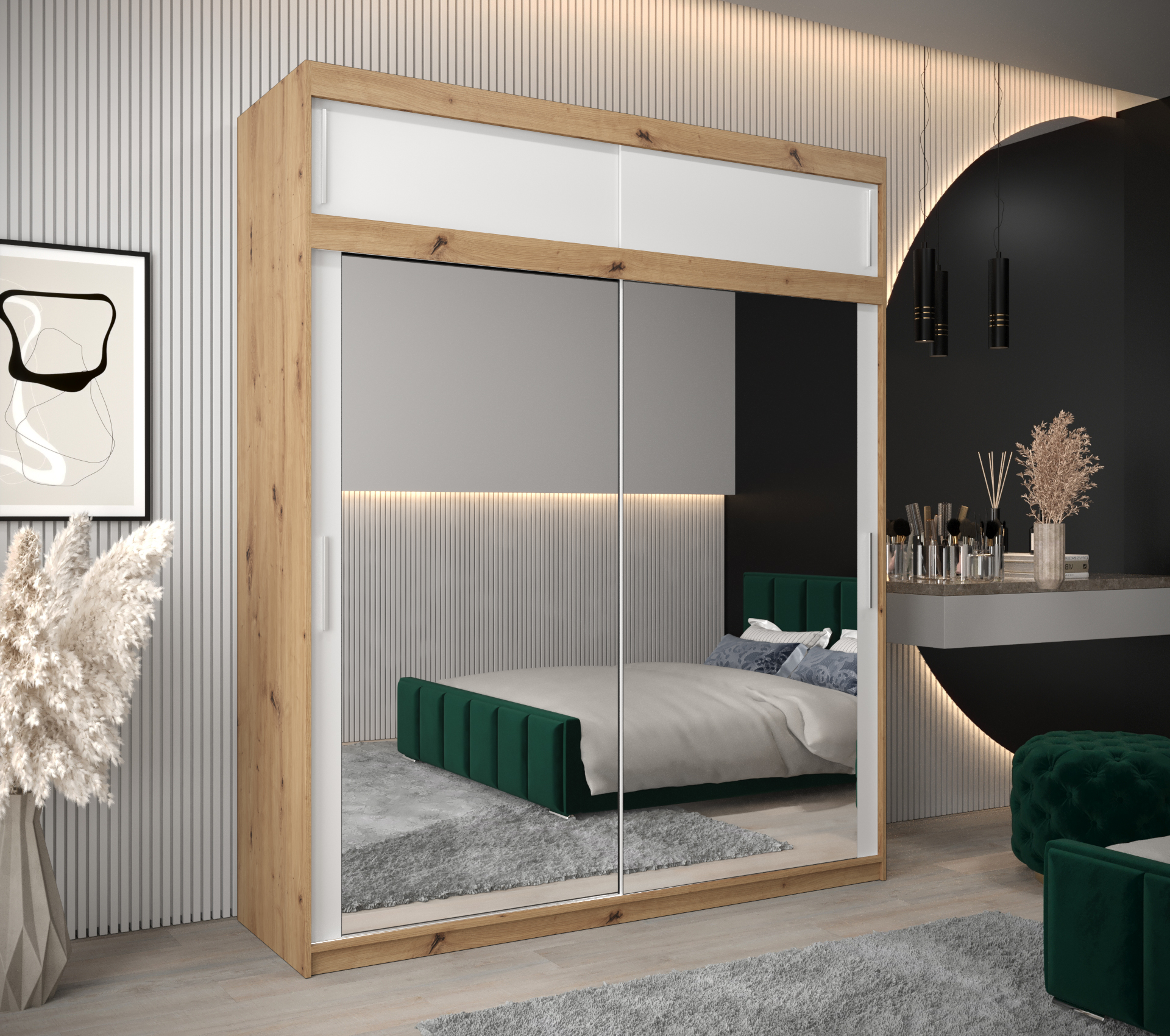 Šatní skříň Abi T3 s nástavcem je ideální volbou pro ty, kteří hledají moderní a praktický nábytek do své ložnice. Její elegantní design v dekoru dub artisan a bílými posuvnými dveřmi dodává každému interiéru nádech sophistication. S rozměry 200 cm nabízí dostatek úložného prostoru pro vaše oblečení a doplňky.