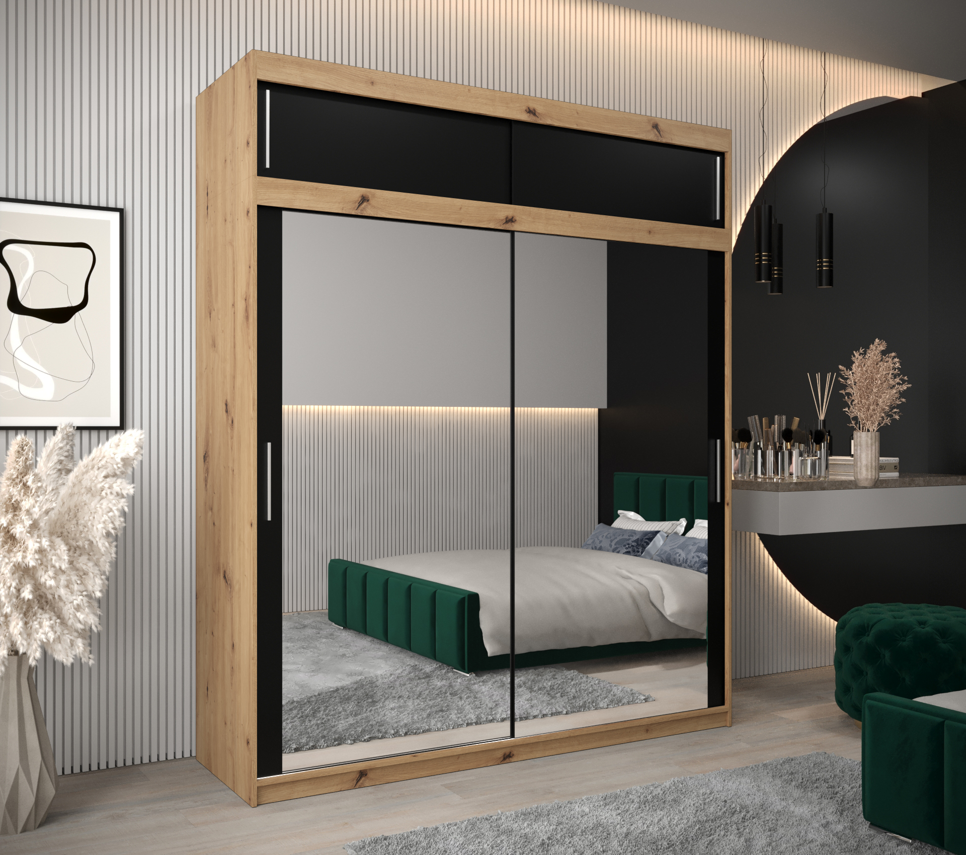 Šatní skříň Abi T3 s nástavcem je ideální volbou pro každého, kdo hledá stylový a funkční nábytek do ložnice. Její moderní design v barvě dub Artisan s elegantními černými posuvnými dveřmi se skvěle hodí do různých interiérů, čímž dodává prostoru na eleganci a styl.