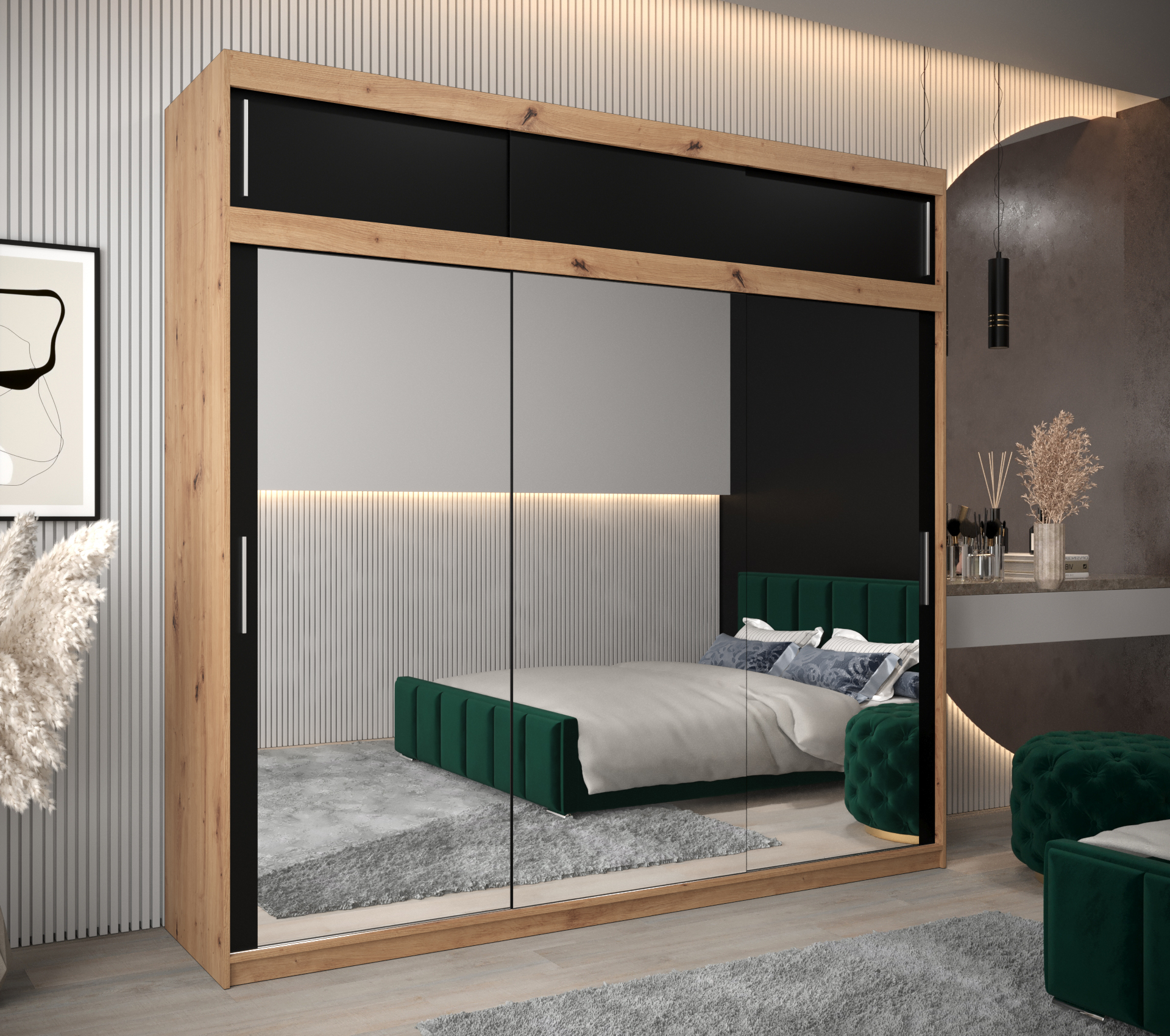 Šatní skříň Abi T3 je ideálním řešením pro ty, kteří hledají moderní a prostorný nábytek do své ložnice. S rozměry 250 cm a elegantním designem v barvě dub artisan se stane dominantou vašeho interiéru.