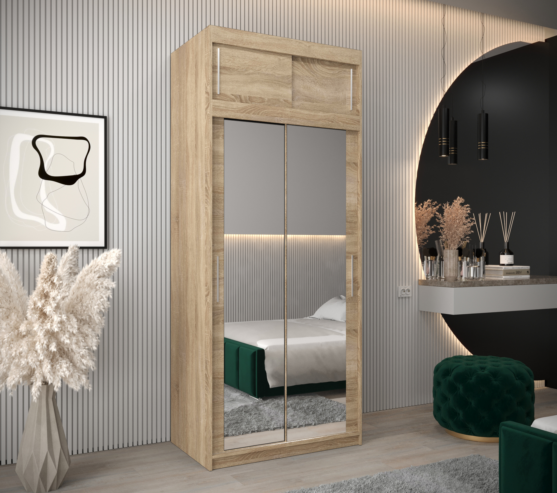 Odstíny prezentované na fotografiích jsou ilustrační a mohou se lišit od skutečných barev podle nastavení vašeho zobrazovacího zařízení. Pro více informací o dalších modelech skříní a ložnicového nábytku navštivte naši hlavní stránku.
