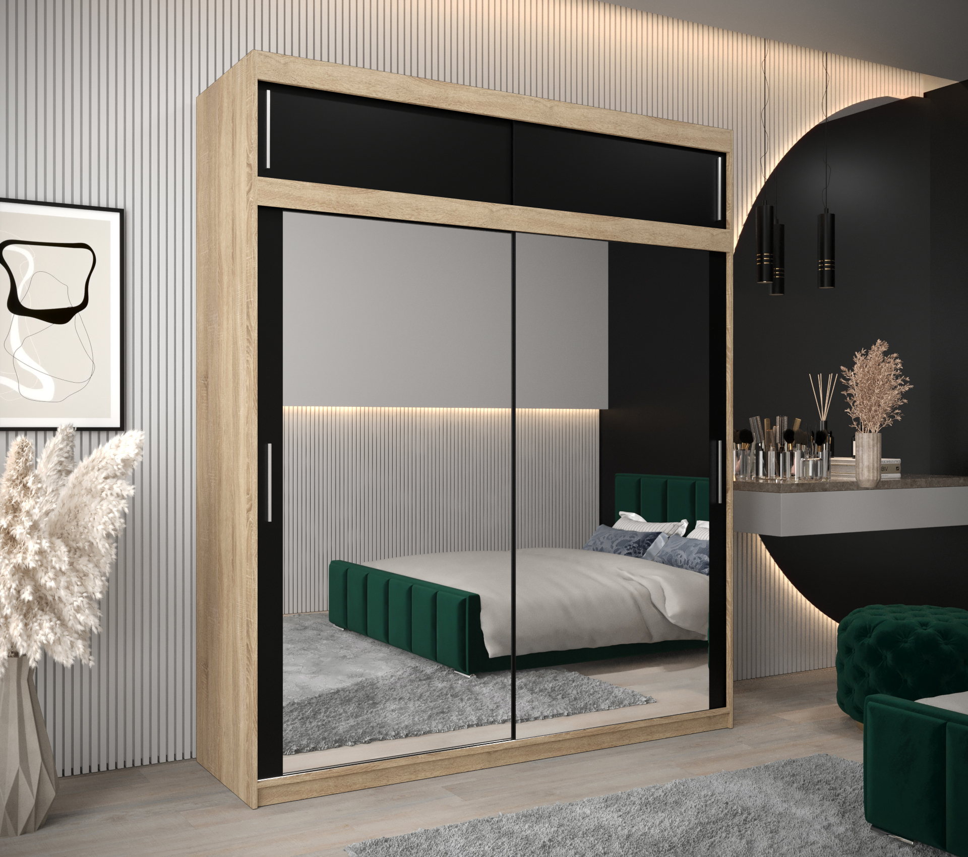 Skříň je také vybavena zrcadlem, které opticky zvětšuje prostor a přidává na praktičnosti. Posuvné dveře šetří místo a usnadňují přístup k obsahu skříně.