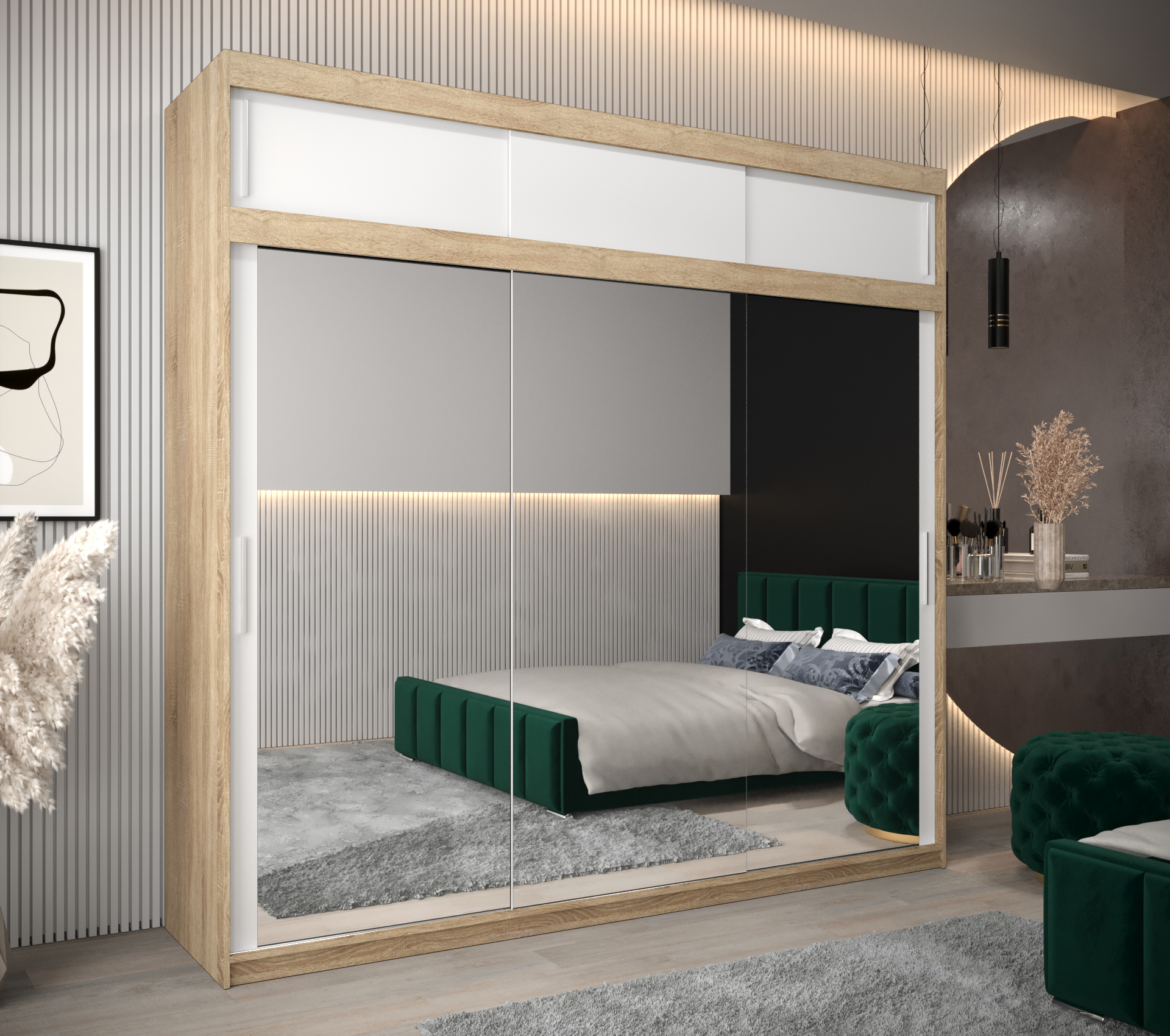 • Zrcadlo: Skříň je vybavena zrcadlem, které opticky zvětšuje prostor a zároveň slouží jako praktický prvek při oblékání.