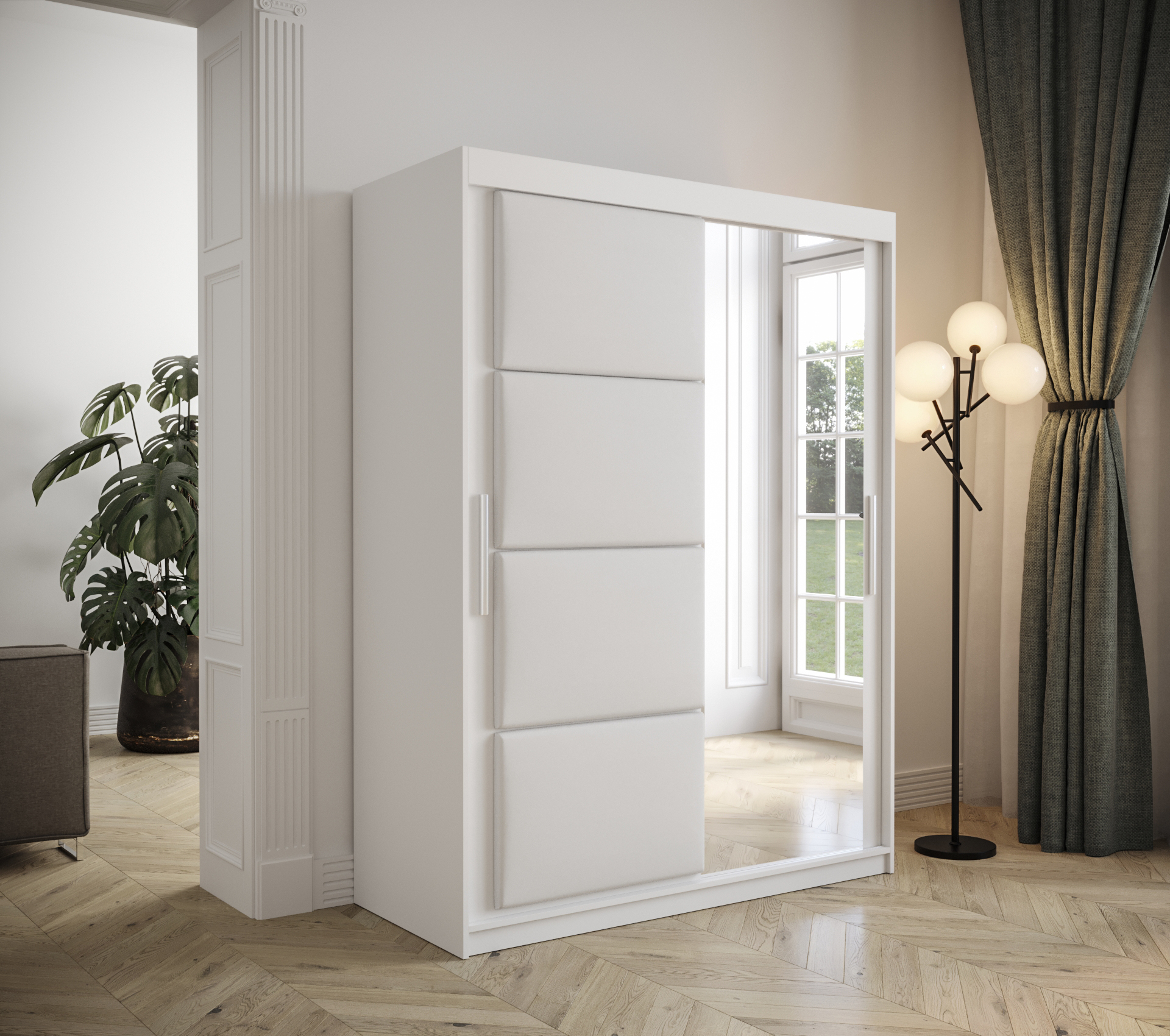 Posuvné dveře skříně jsou zdobeny čalouněnými panely, které dodávají skříni na eleganci. Na dveřích je také k dispozici leštěné zrcadlo, které opticky zvětší prostor vaší místnosti a usnadní ranní přípravy.