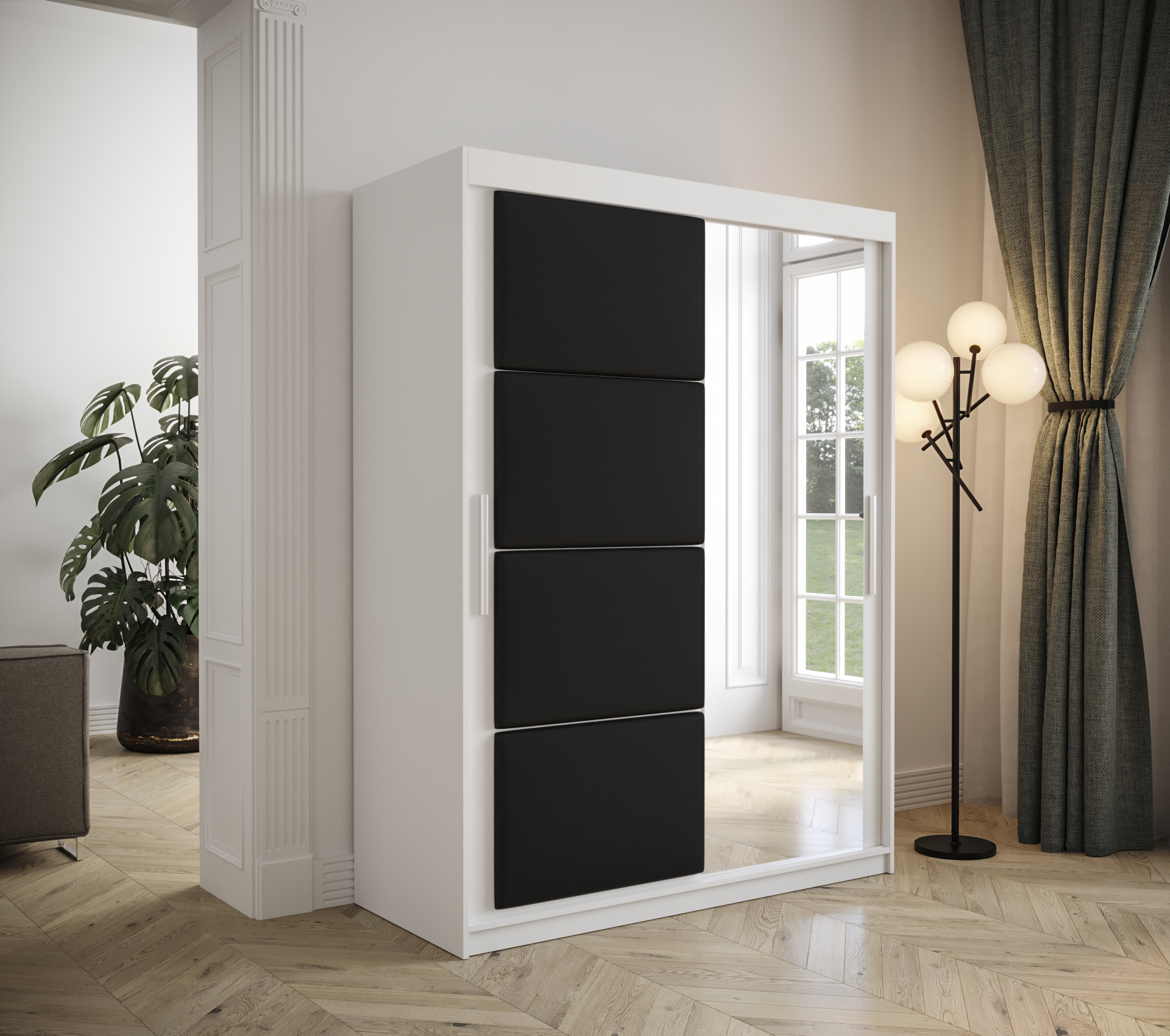 • Čalouněné panely: Posuvné dveře jsou zdobeny čalouněnými panely, které dodají skříni na eleganci.