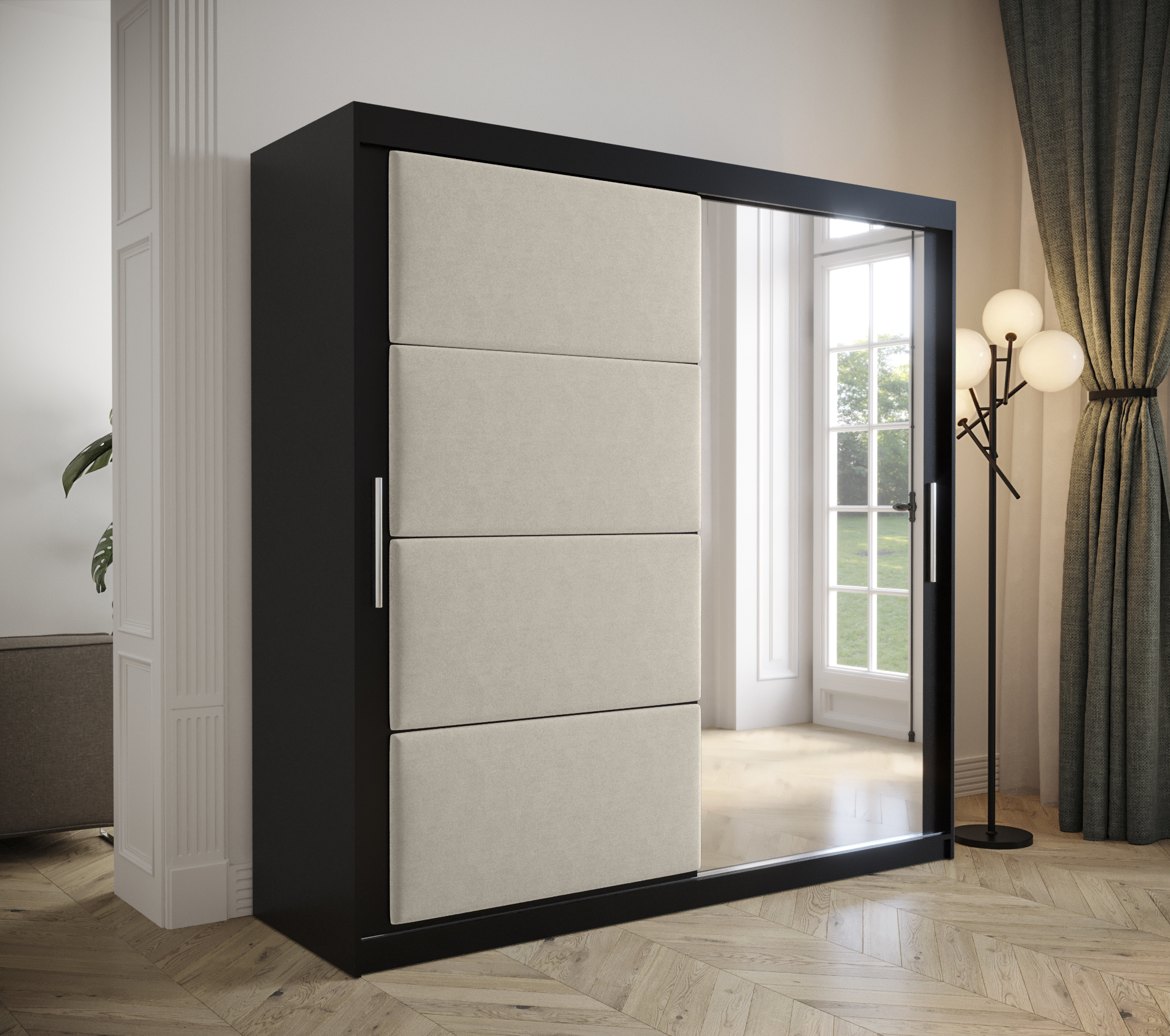 - Ozdobné čalouněné panely: Posuvné dveře jsou zdobeny čalouněnými panely, které dodávají skříni jedinečný vzhled.