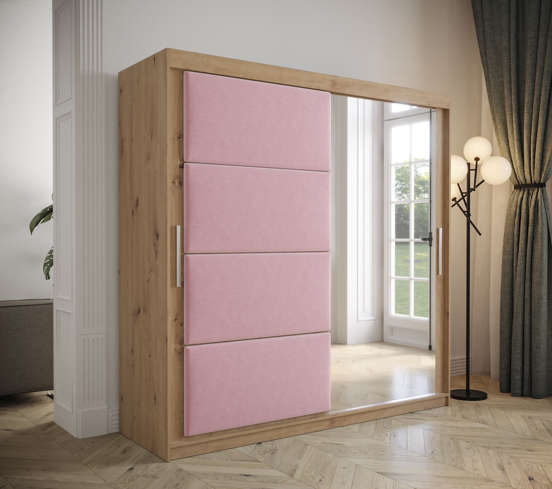 - Ozdobné panely: Posuvné dveře obsahují čalouněné panely, které dodávají skříni jedinečný vzhled.