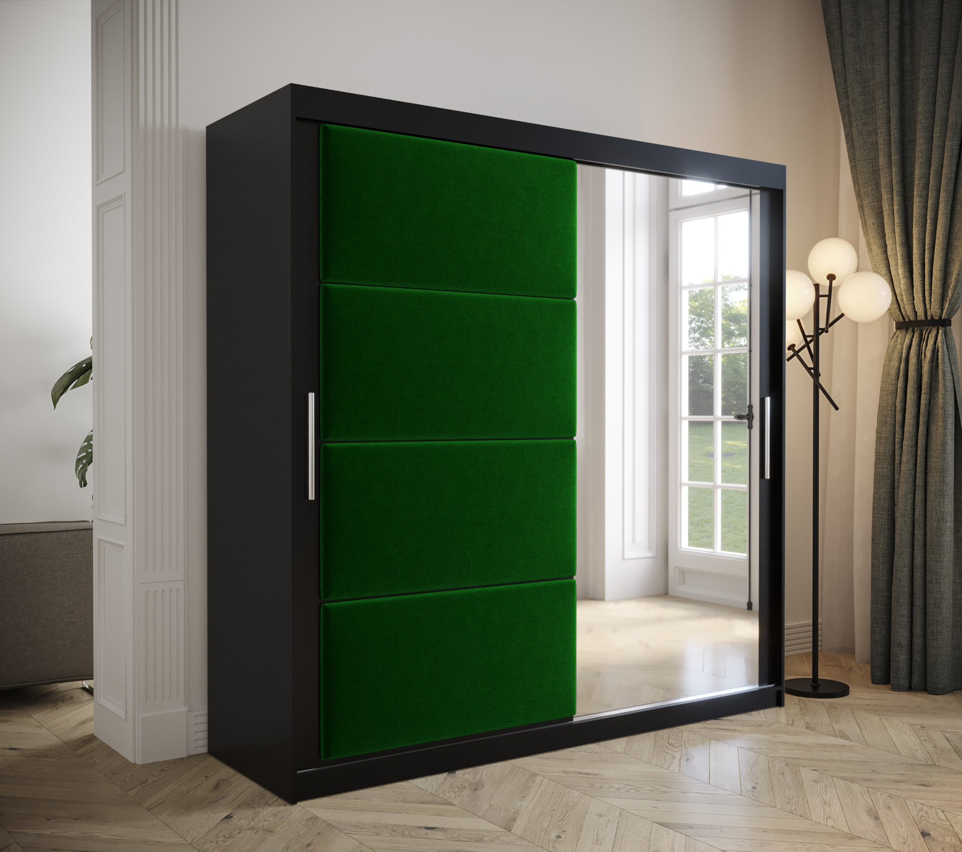 - Ozdobné čalouněné panely: Posuvné dveře jsou navrženy se stylovými čalouněnými panely, které dodávají skříni jedinečný vzhled.
