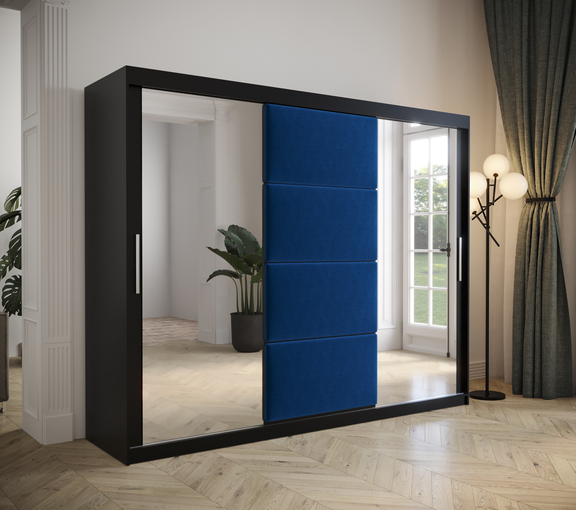 - Stylové designové prvky: Posuvné dveře s čalouněnými panely a zrcadlem jsou nejen praktické, ale také esteticky působivé.