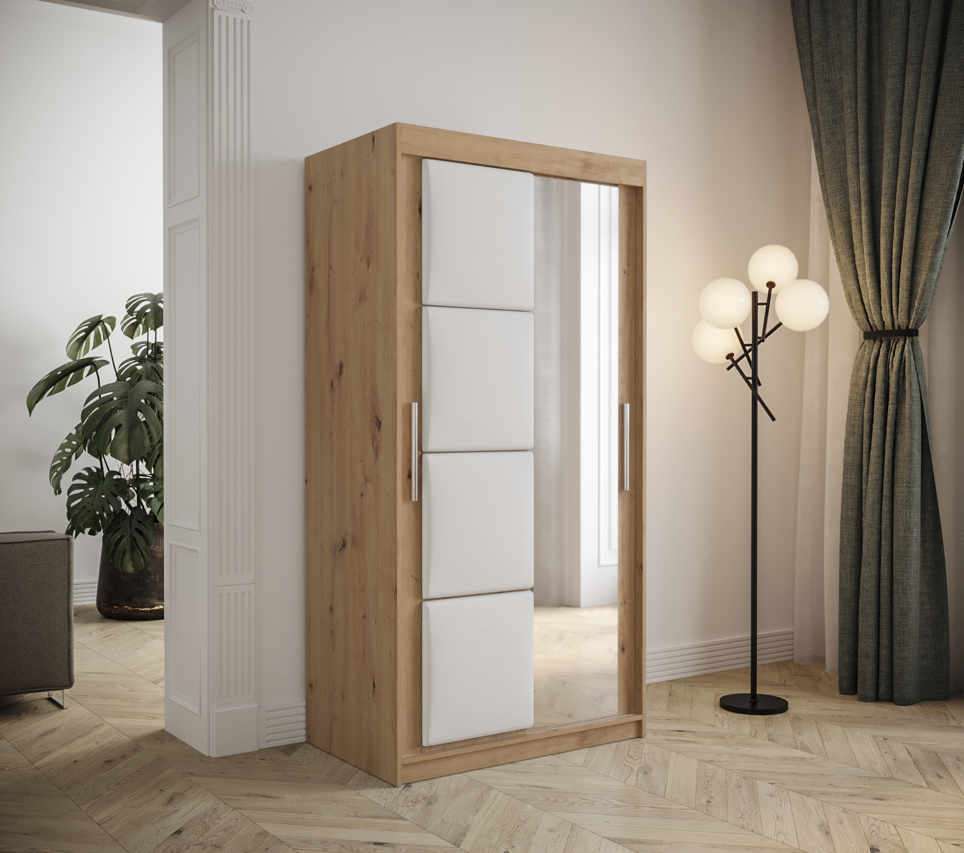 Šatní skříň Abi Tapi představuje ideální řešení pro každého, kdo hledá moderní a praktický nábytek do ložnice. S korpusem v atraktivním odstínu dub artisan a elegantními posuvnými dveřmi z bílé koženky se stane ozdobou každého interiéru.