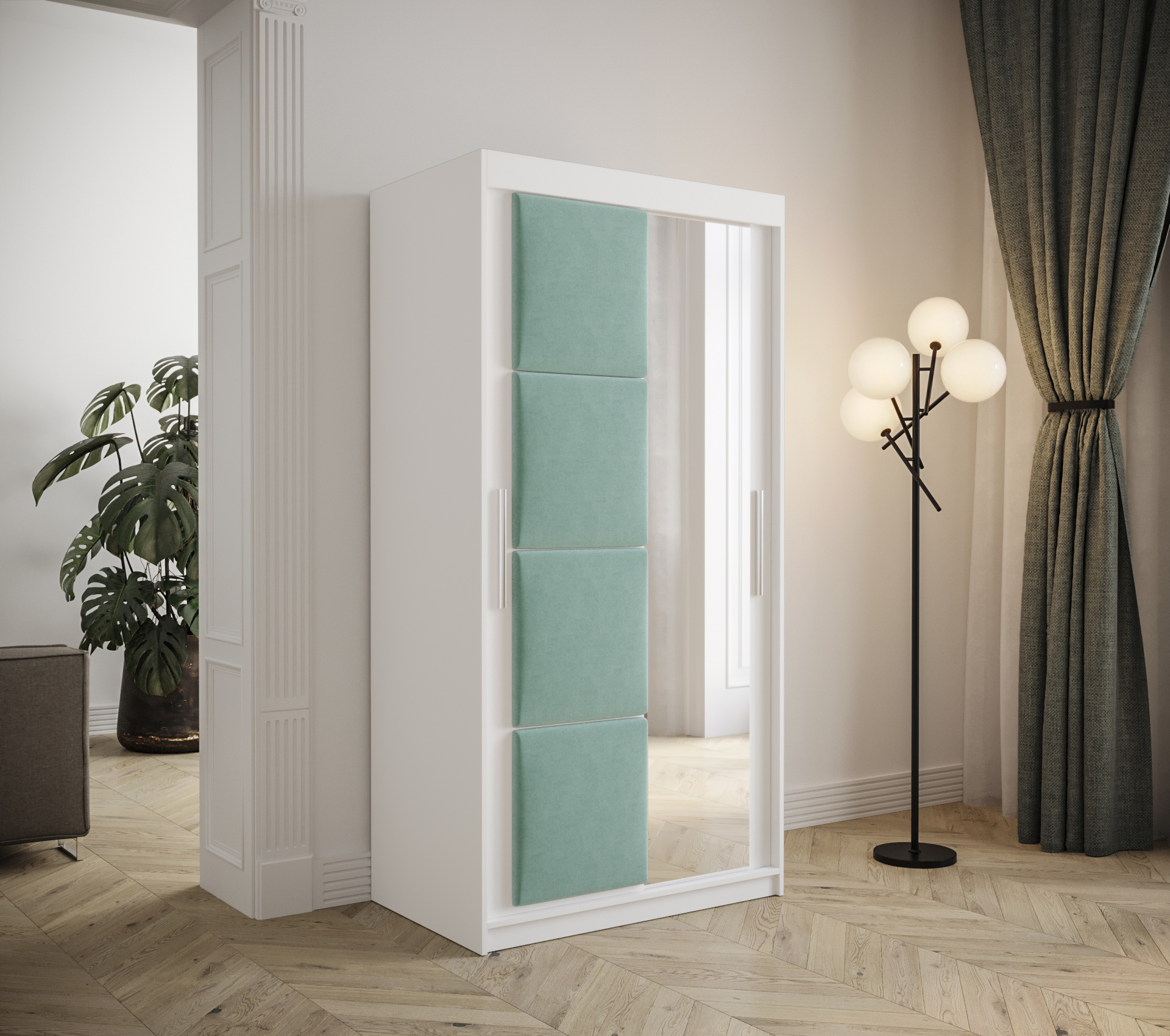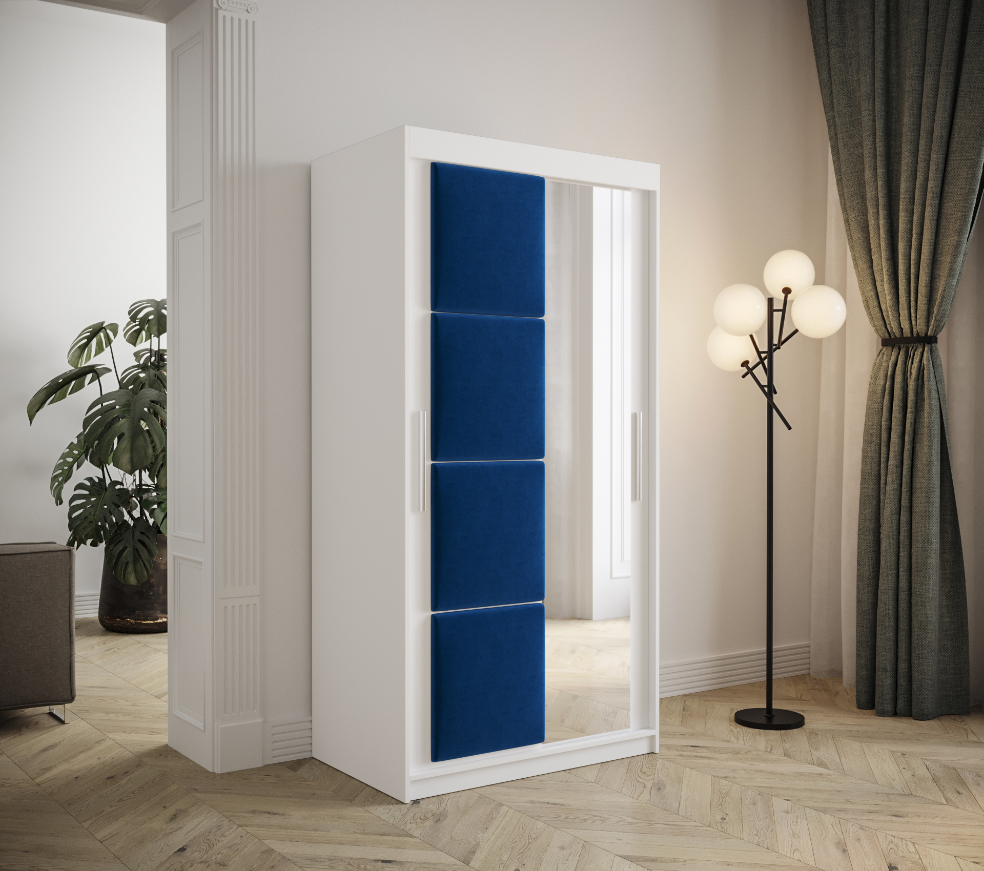 - Ozdobné čalouněné panely: Posuvné dveře jsou zdobeny čalouněnými panely, které dodávají skříni elegantní vzhled.
